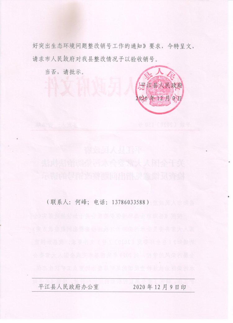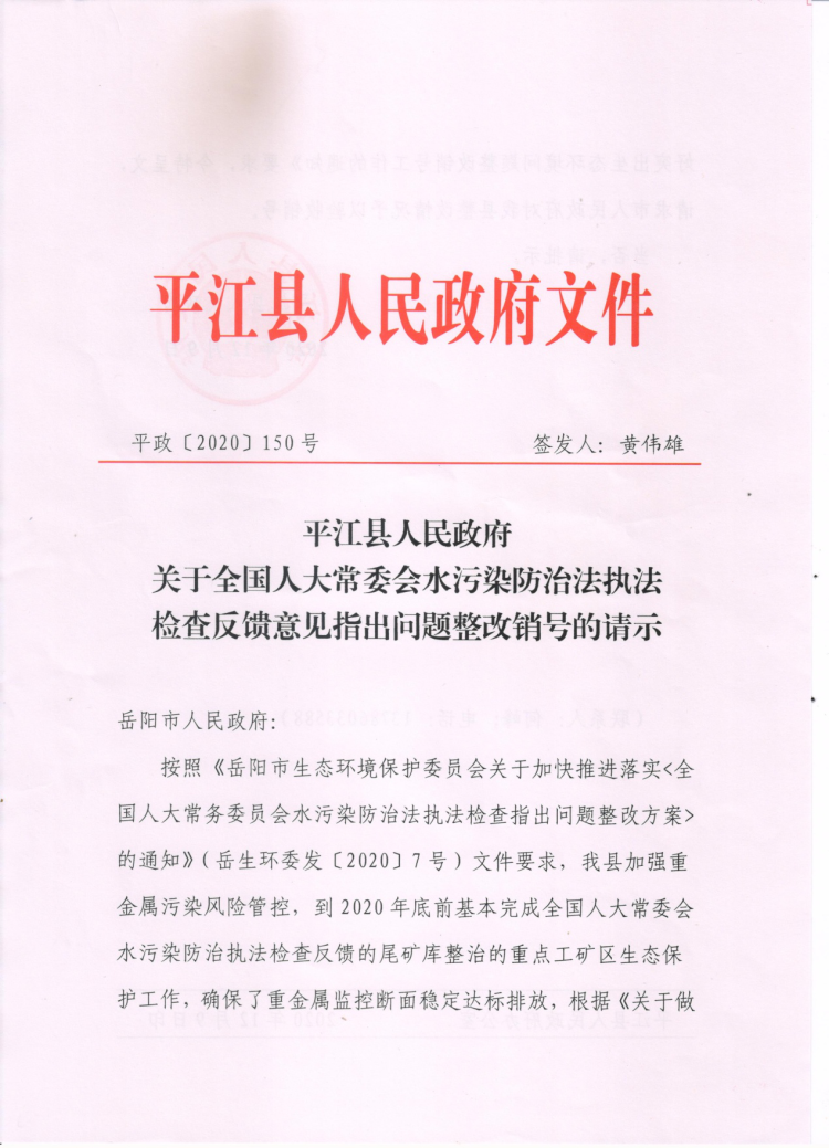 平江县人民政府关于全国人大常委会水污染防治法执法检查反馈意见指出问题整改销号的请示