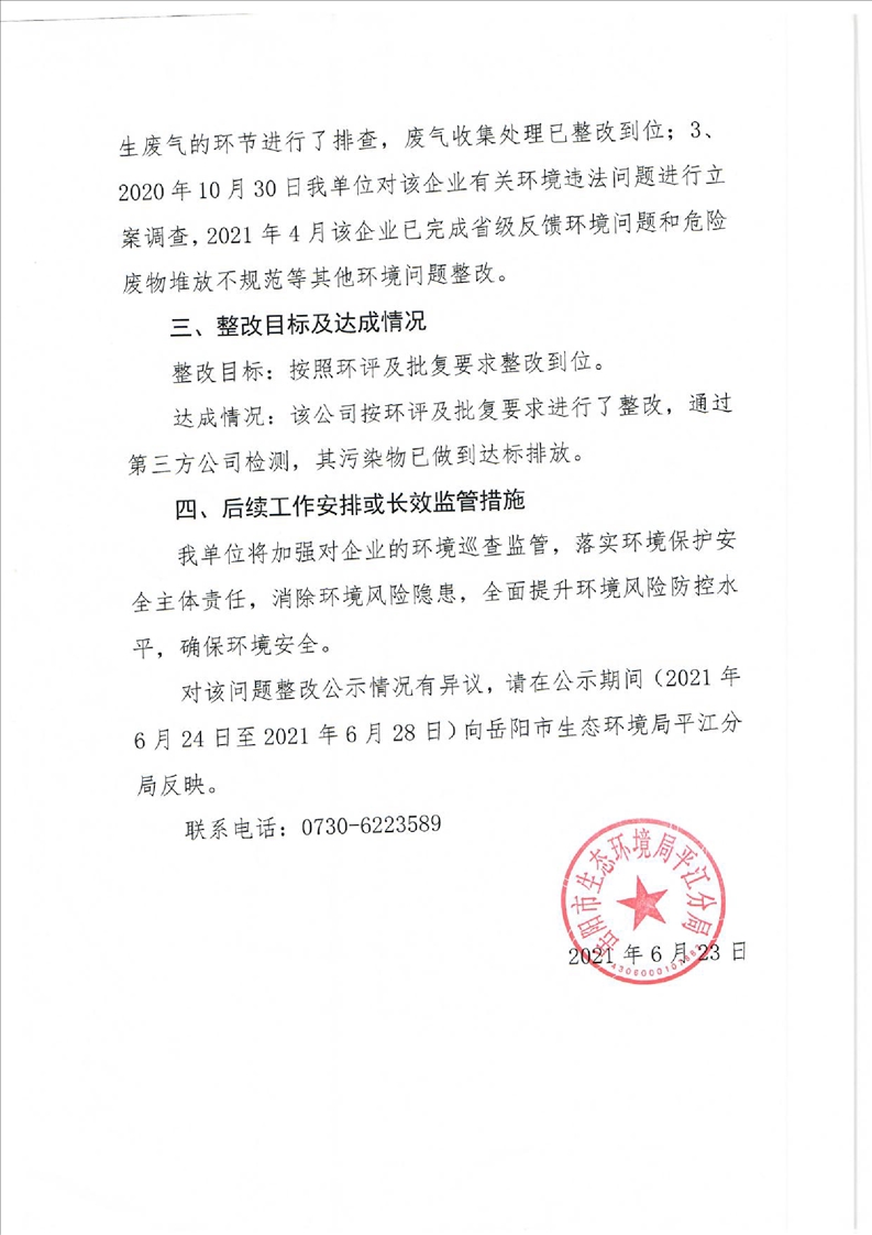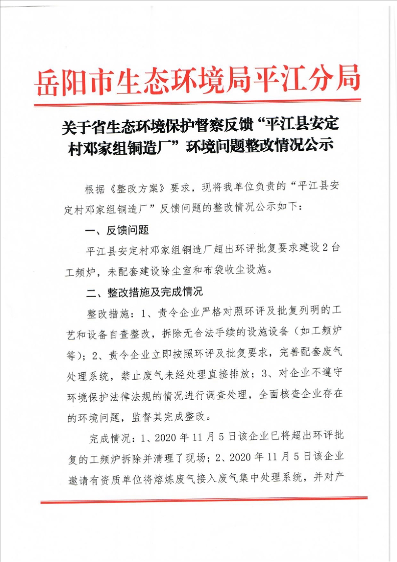 关于省生态环境保护督察反馈“平江县安定村邓家组铜造厂”环境问题整改情况公示