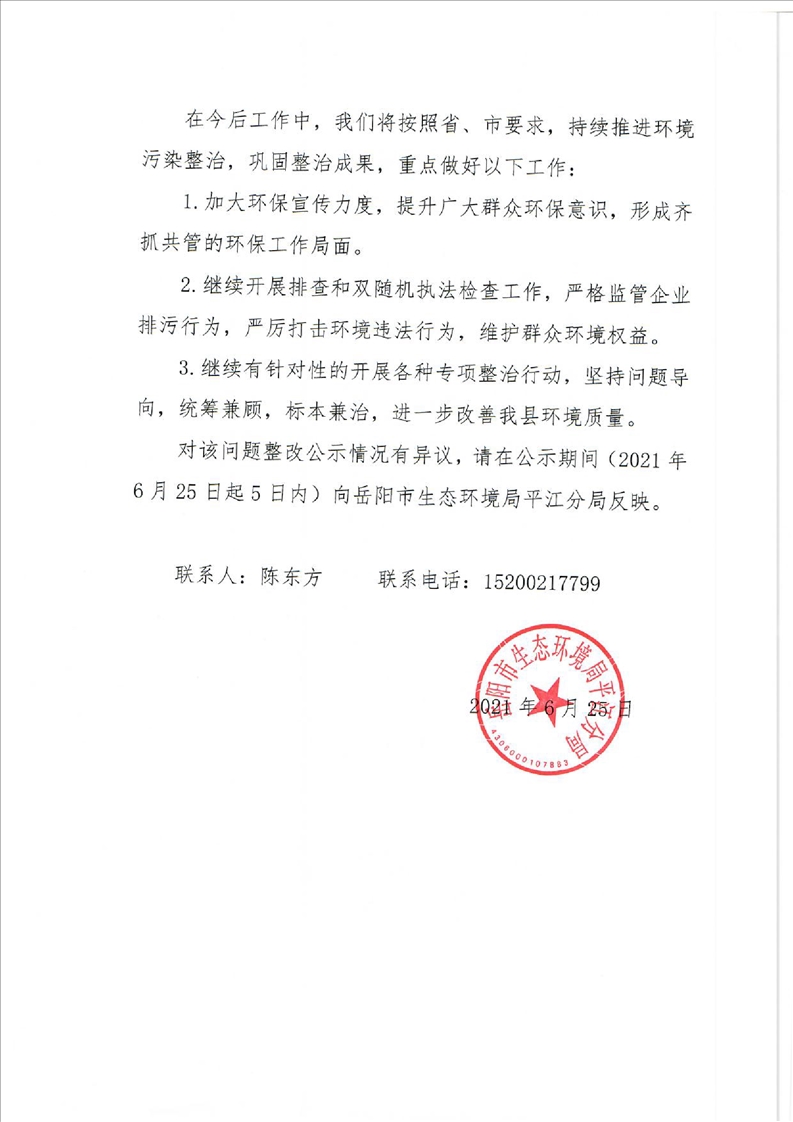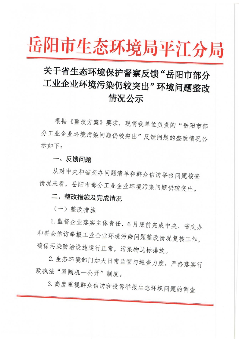 关于省生态环境保护督察反馈“岳阳市部分工业企业环境污染仍较突出”环境问题整改情况公示
