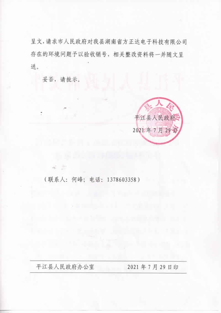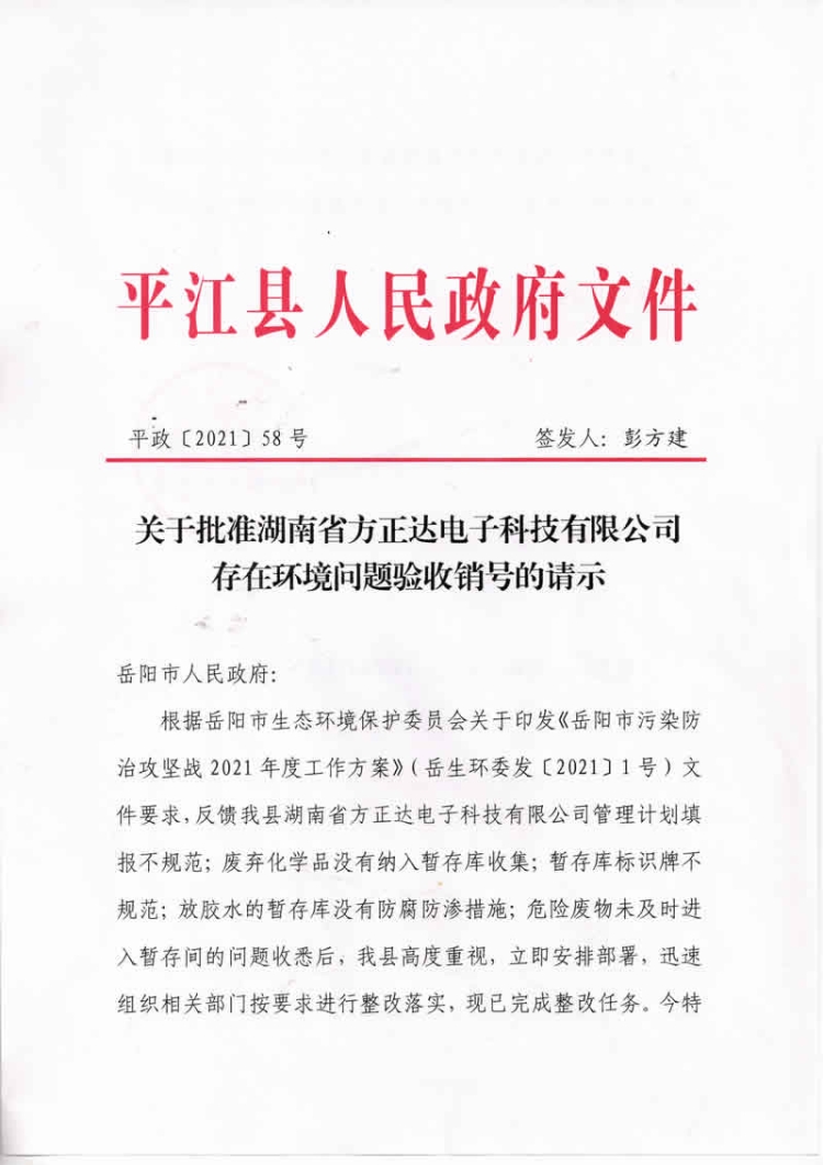 关于批准湖南省方正达电子科技有限公司存在环境问题验收销号的请示