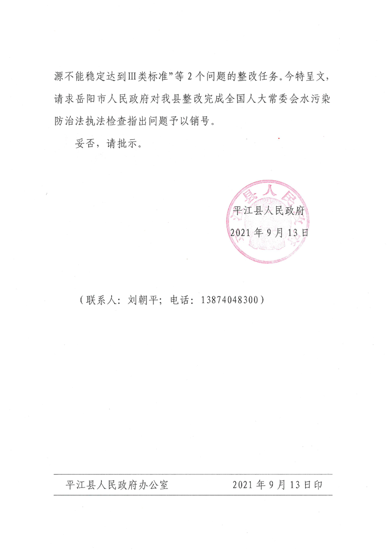 平江县人民政府关于对我县整改完成全国人大常委会水污染防治法执法检查指出问题予以销号的请示