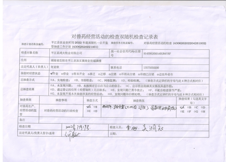 平江县农业农村局 对平江县鸿大牧业有限公司的行政检查