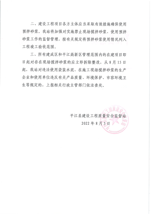 平建质安监发〔2022〕22号 关于落实《平江县人民政府关于禁止在县城建成区等区域建设施工现场搅拌砂浆的通告》的通知