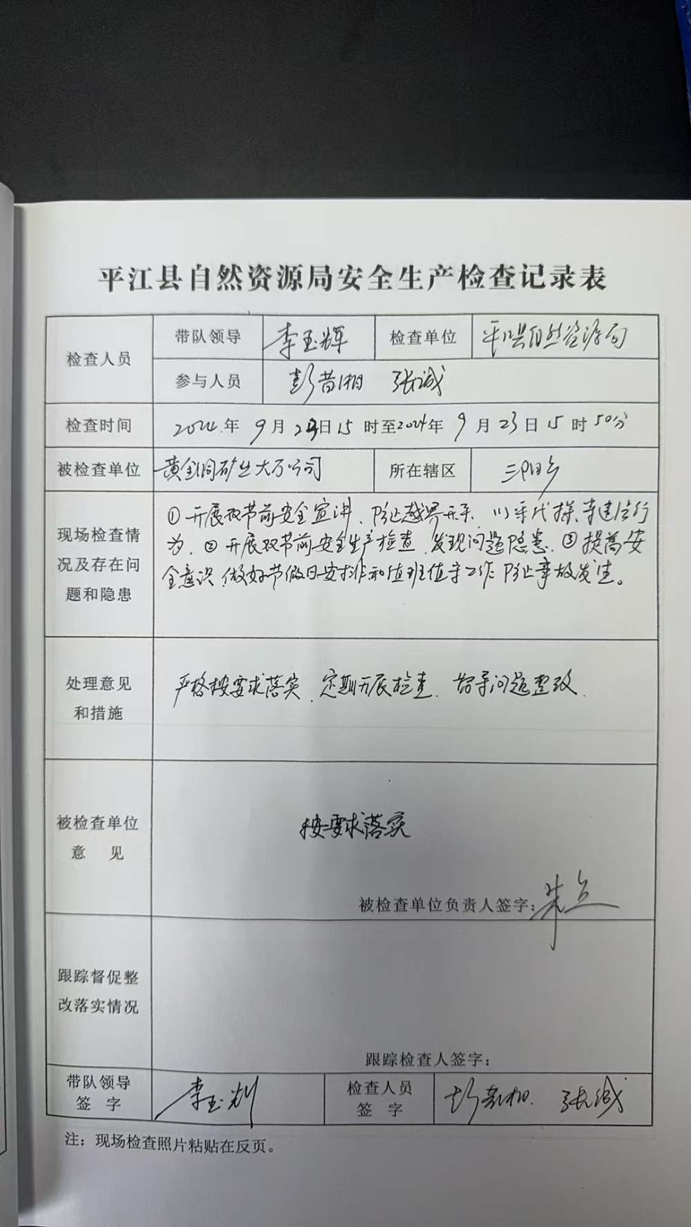 黄金洞矿业大万公司安全生产检查记录表
