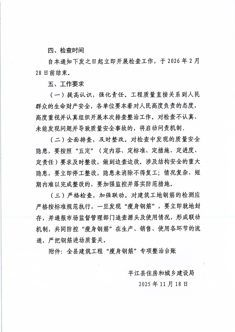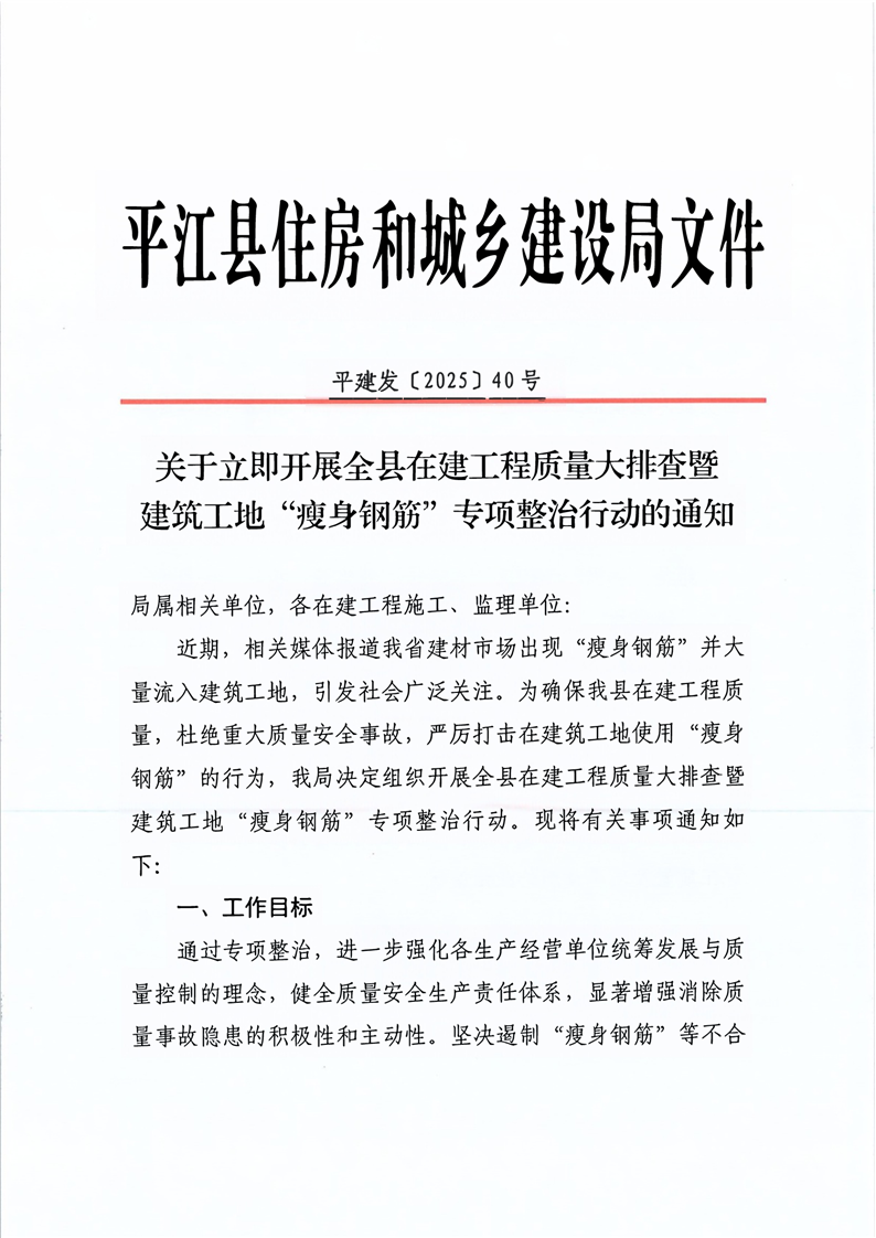 关于立即开展全县在建工程质量大排查暨建筑工地“瘦身钢筋”专项整治行动的通知(平建发〔2025〕40号 )