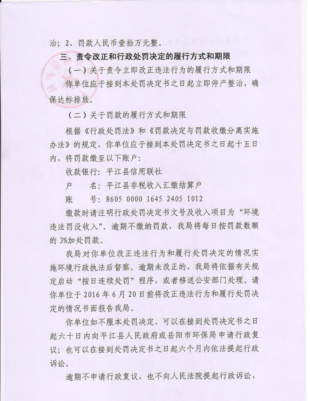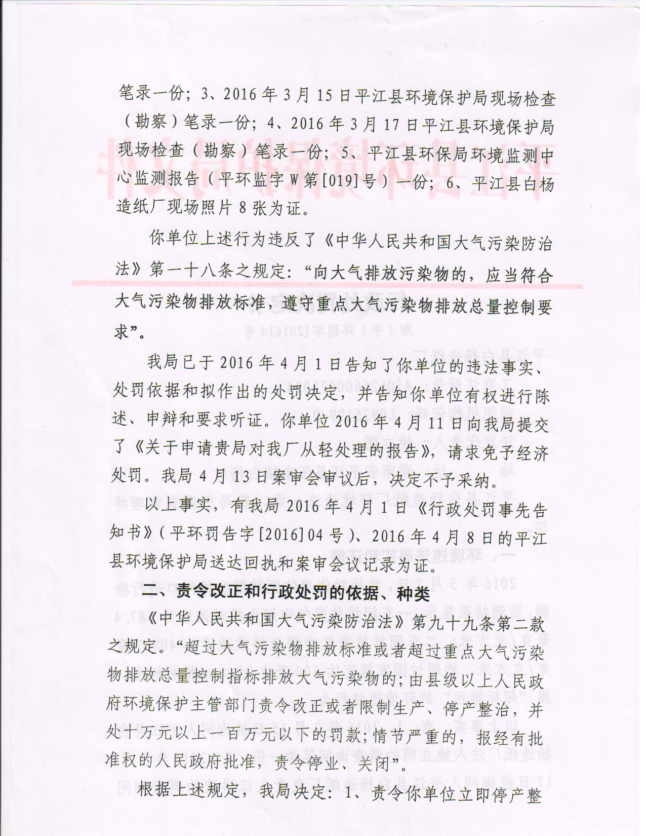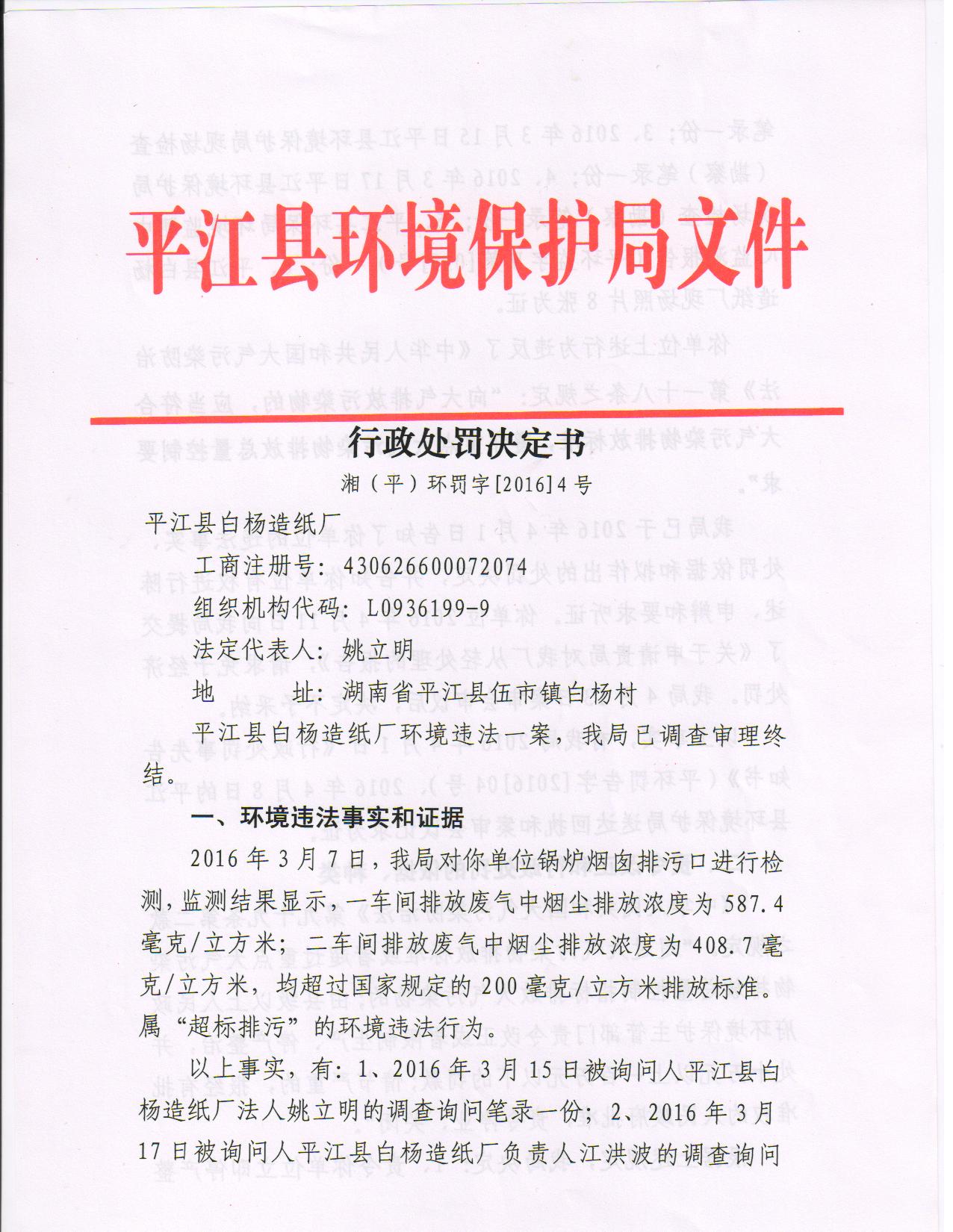 湘(平)环罚字[2016]4号——白杨造纸厂