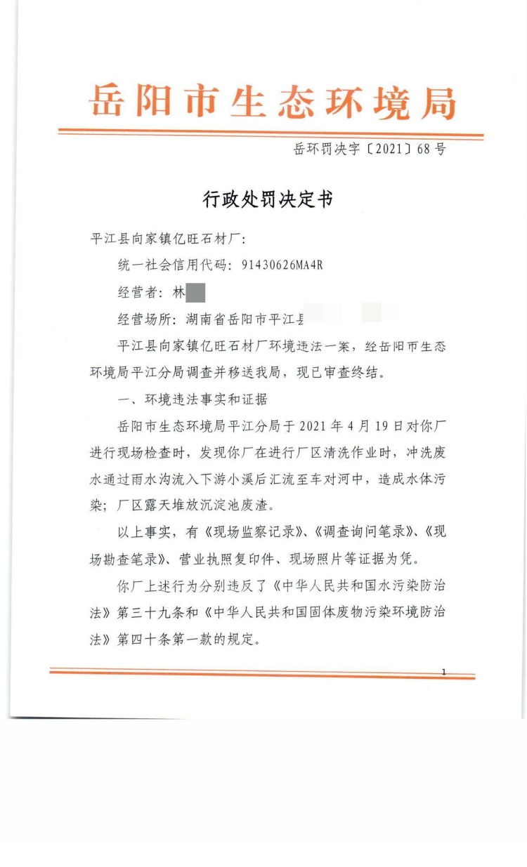 平江县向家镇亿旺石材厂68号行政处罚决定书