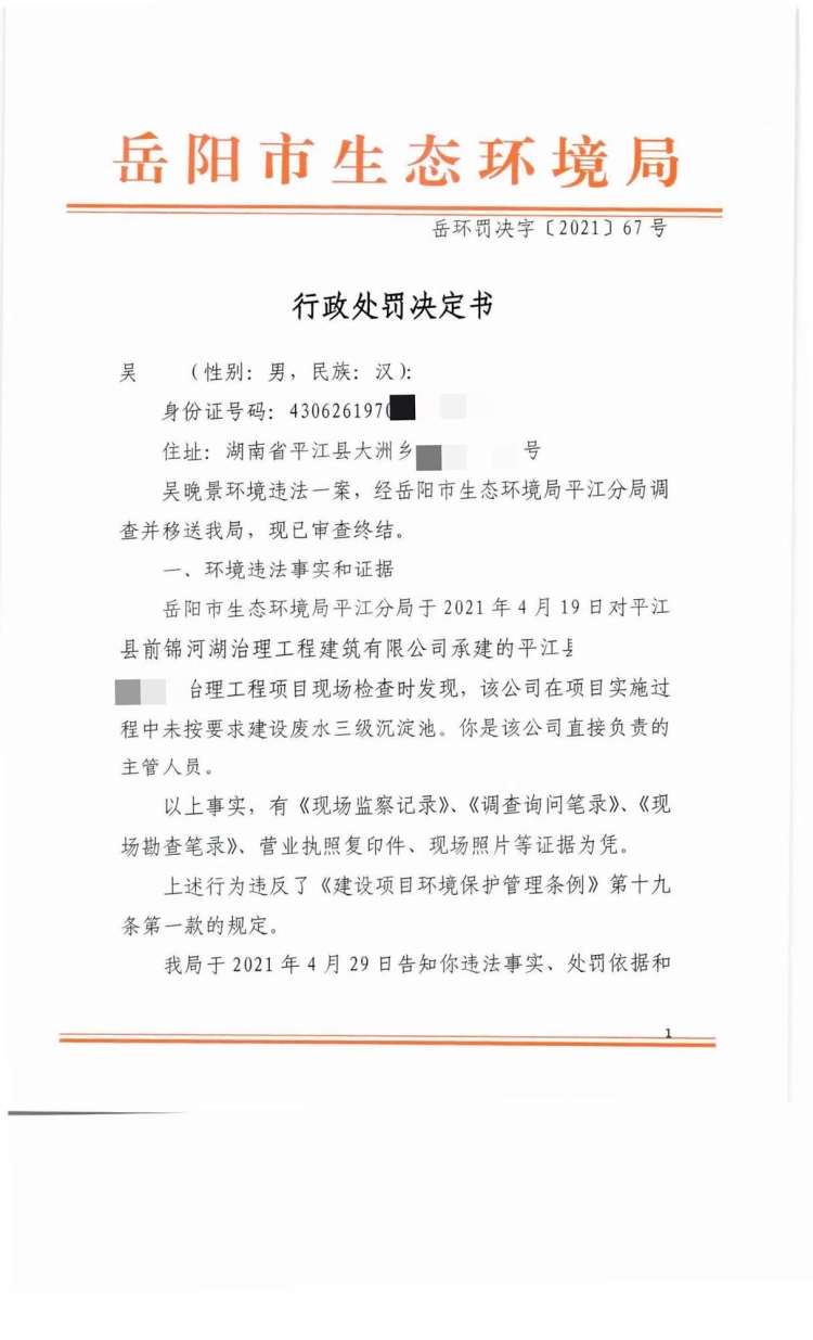 平江县前锦河湖治理工程建筑有限公司67号行政处罚决定书