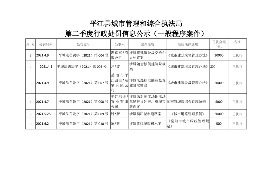 2021年平江县城市管理行政执法局第二季度行政处罚信息公示 (一般程序案件)
