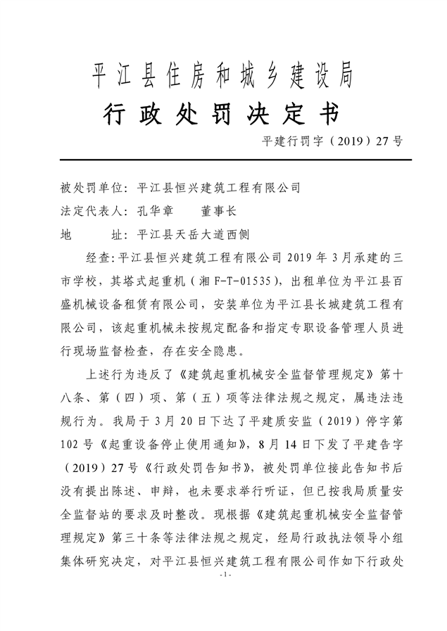 行政处罚决定书平建行罚字(2019)27号