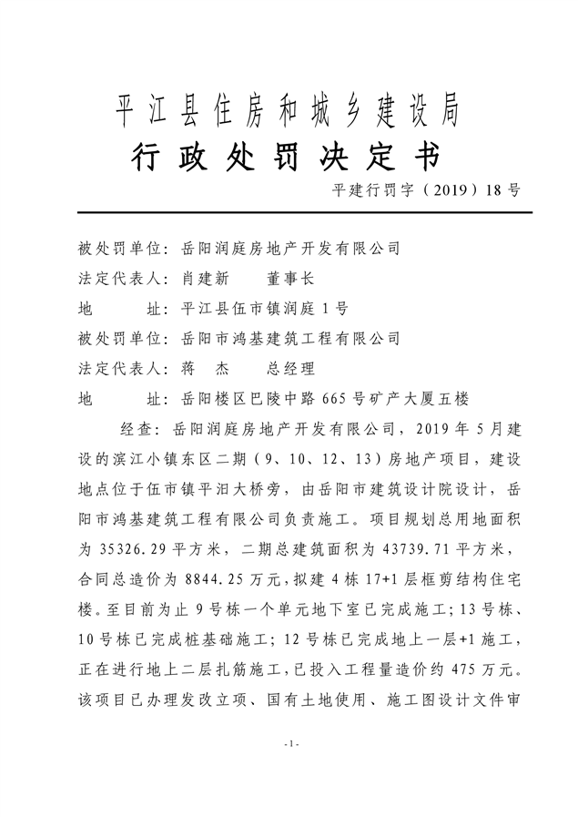 行政处罚决定书平建行罚字(2019)18号