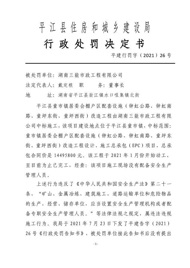 行政处罚决定书平建行罚字(2021)26号