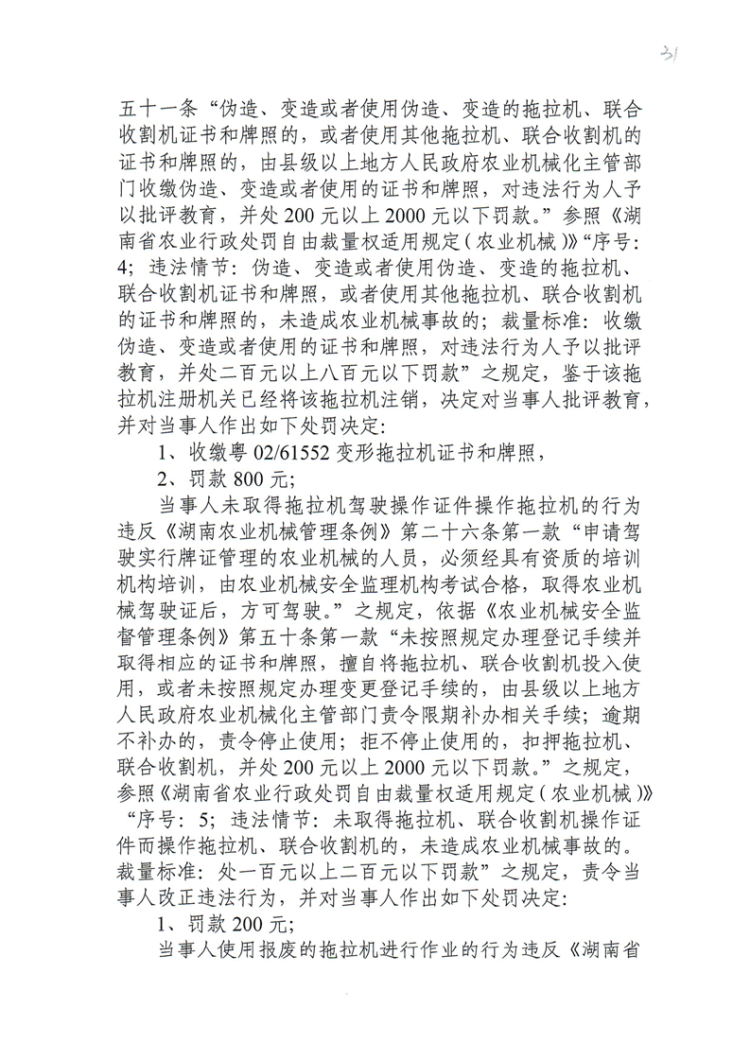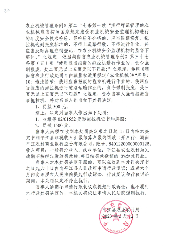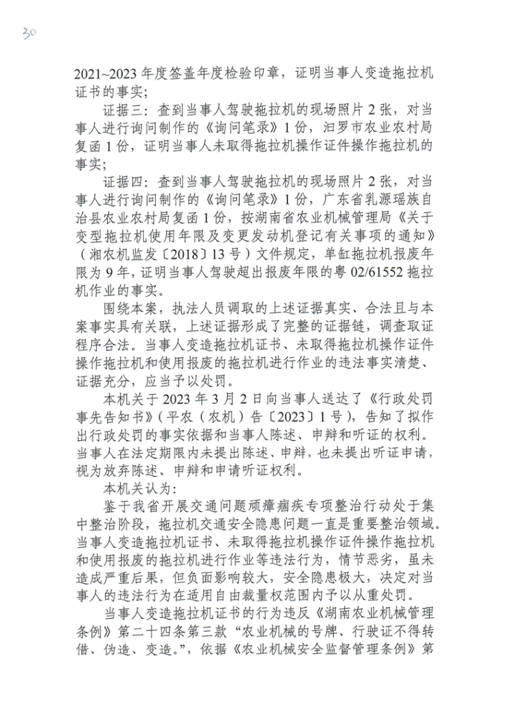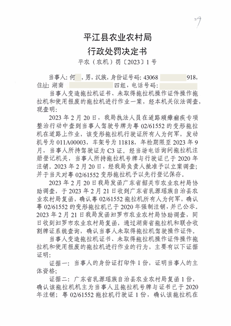 平江县农业农村局行政处罚决定书 平农(农机)罚〔2023〕1号