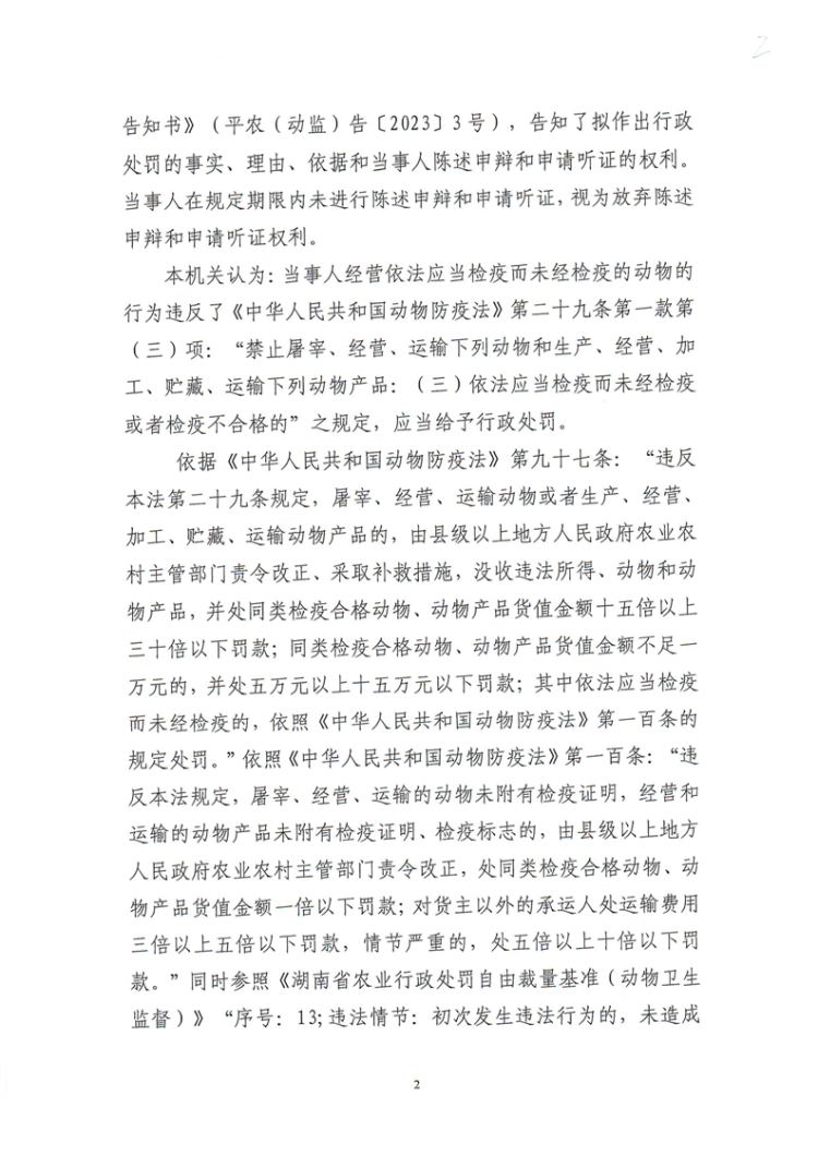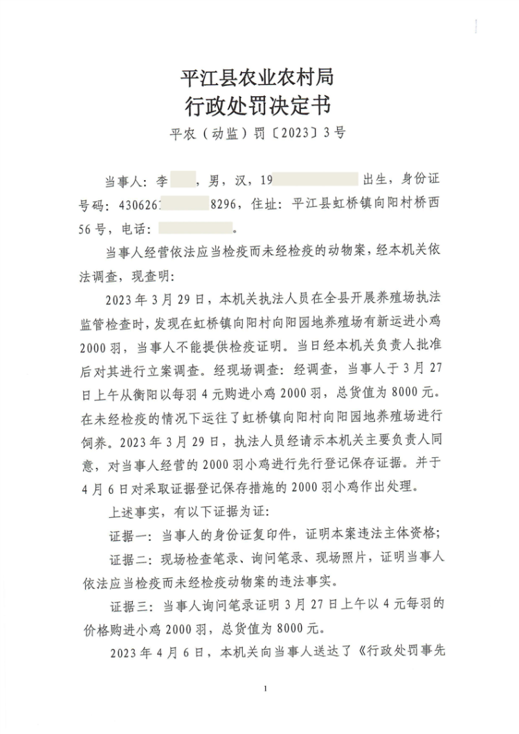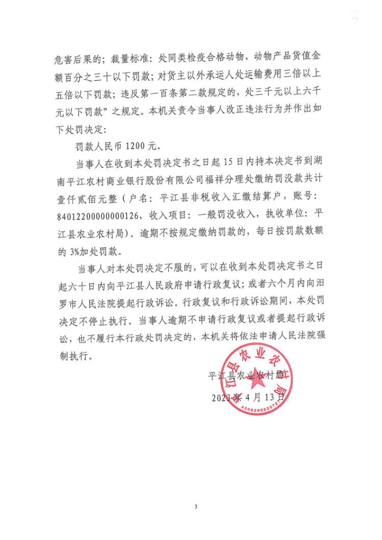 平江县农业农村局行政处罚决定书 平农(动监)罚〔2023〕3号