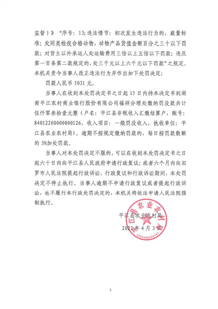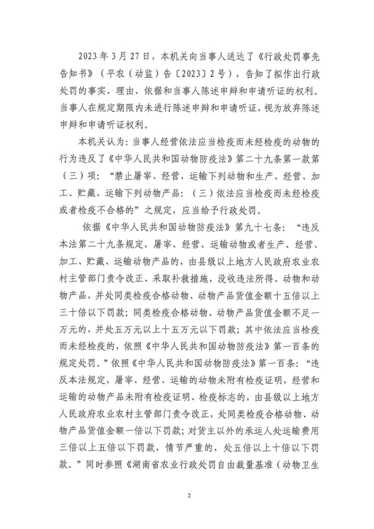 平江县农业农村局行政处罚决定书 平农(动监)罚〔2023〕2号
