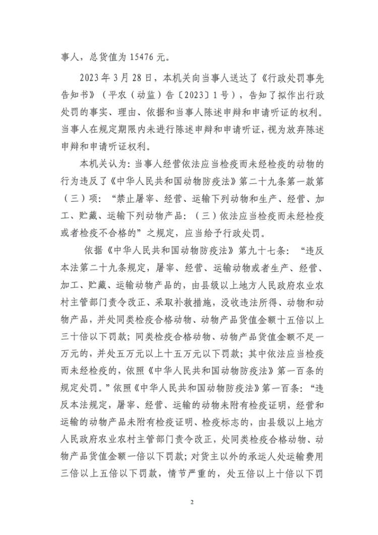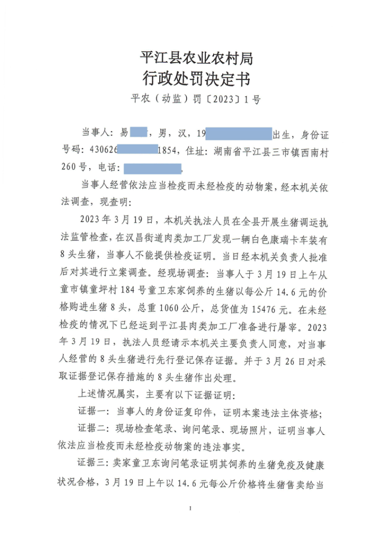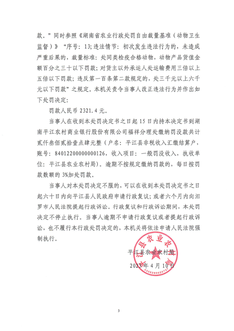 平江县农业农村局行政处罚决定书 平农(动监)罚〔2023〕1号