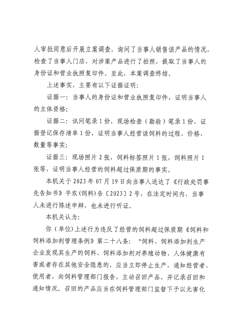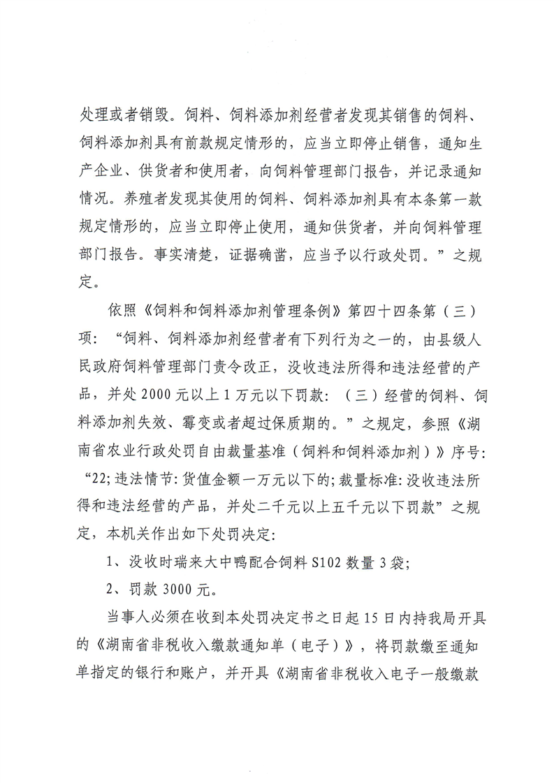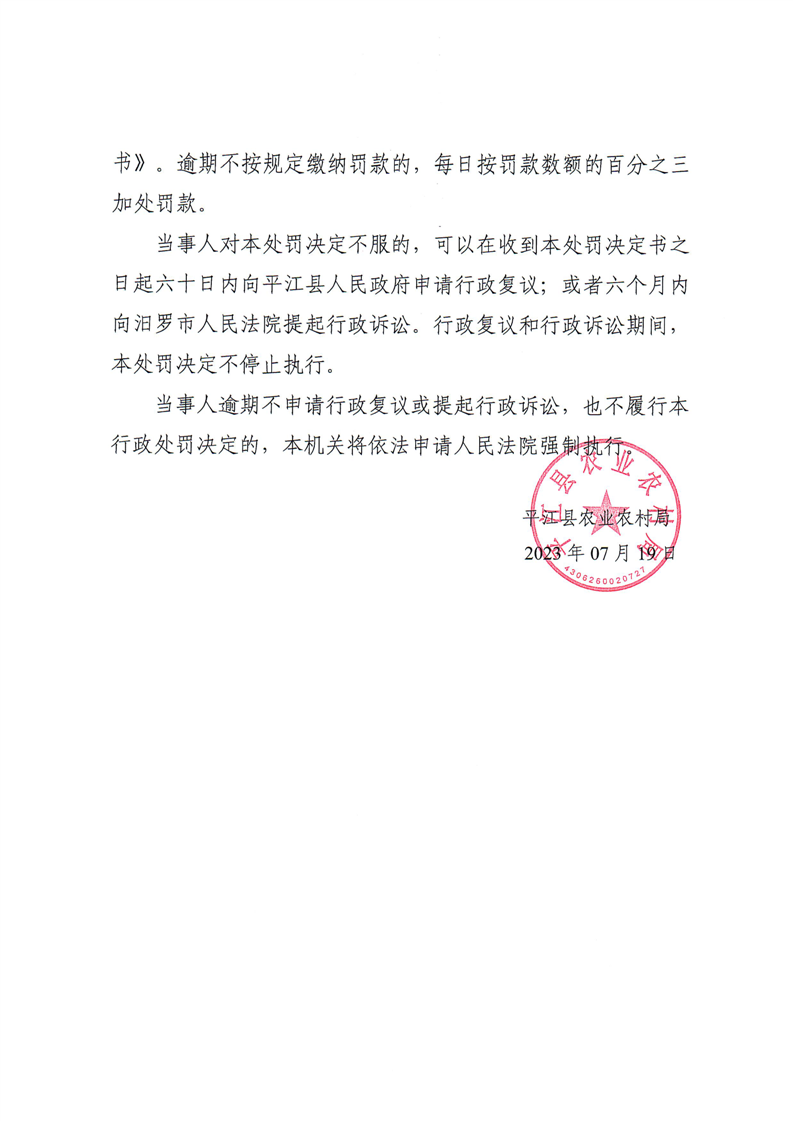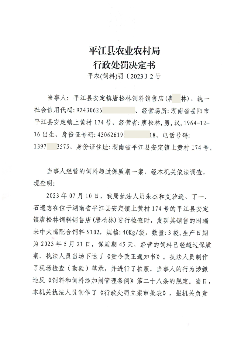 平江县农业农村局行政处罚决定书 平农(饲料)罚〔2023〕2号