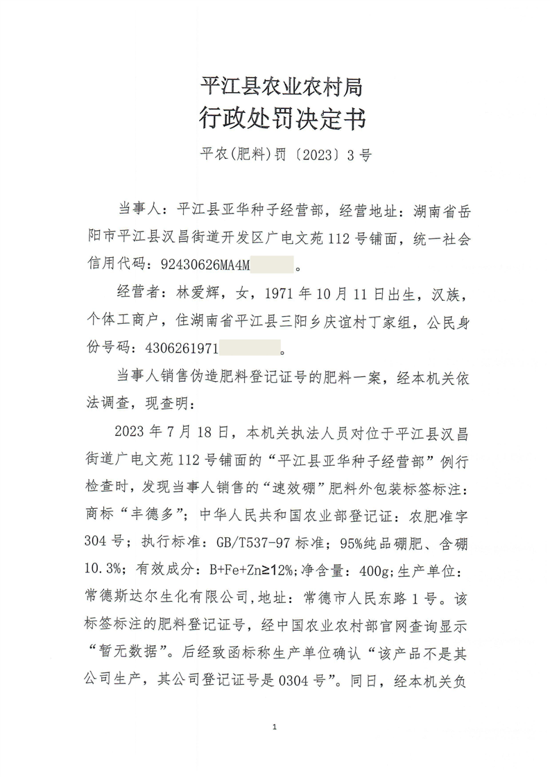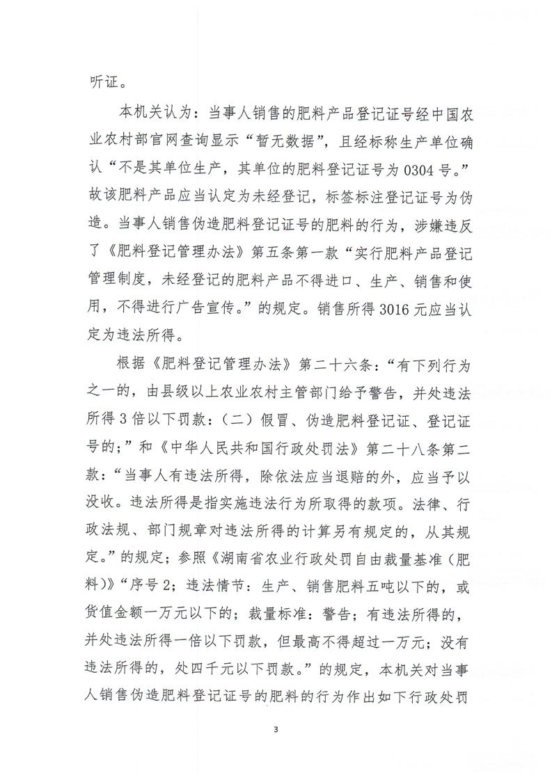 平江县农业农村局行政处罚决定书 平农(肥料)罚〔2023〕3号