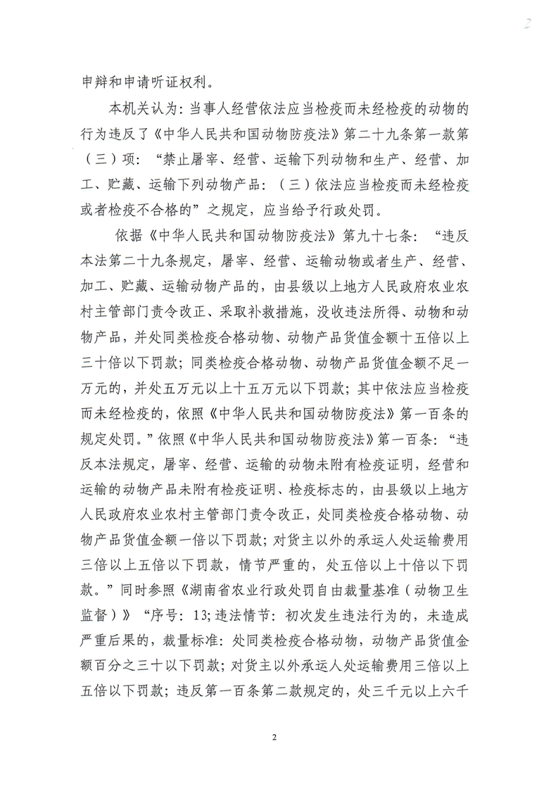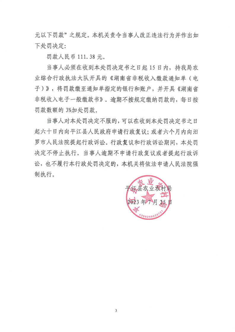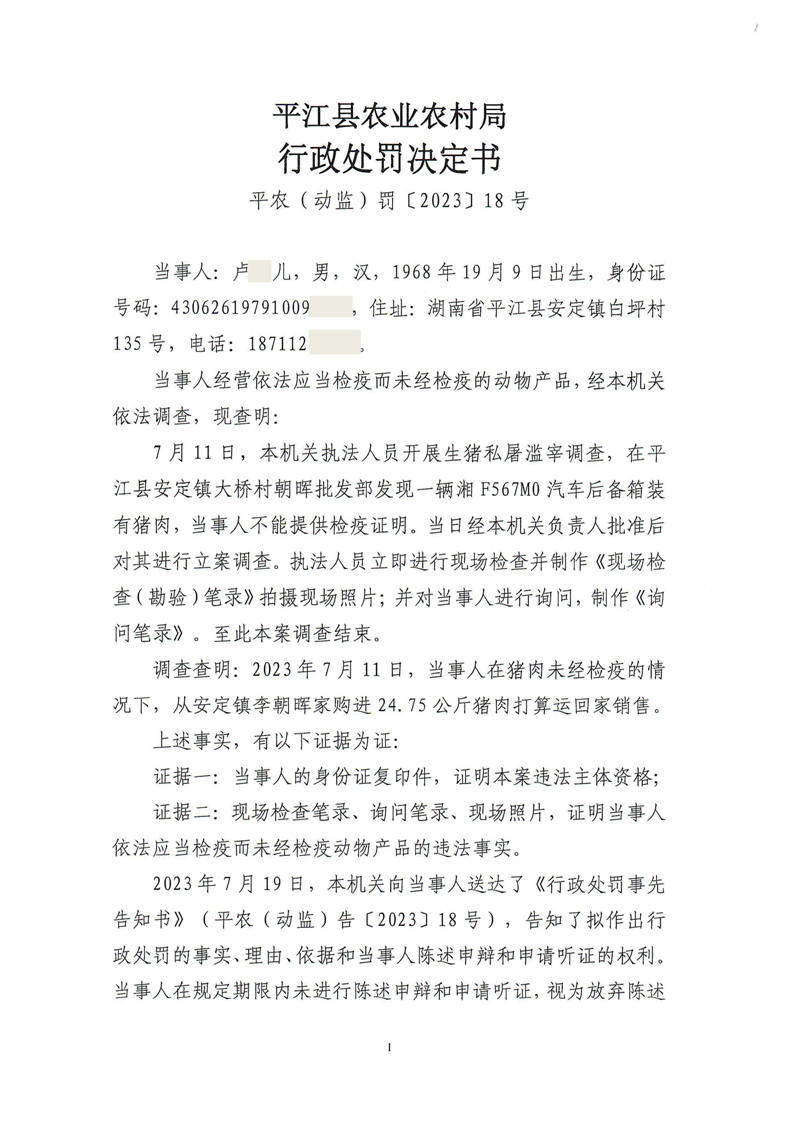 平江县农业农村局行政处罚决定书 平农(动监)罚〔2023〕18号