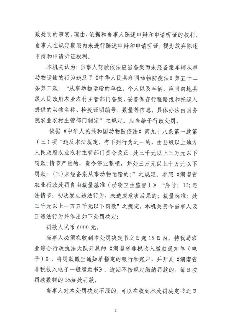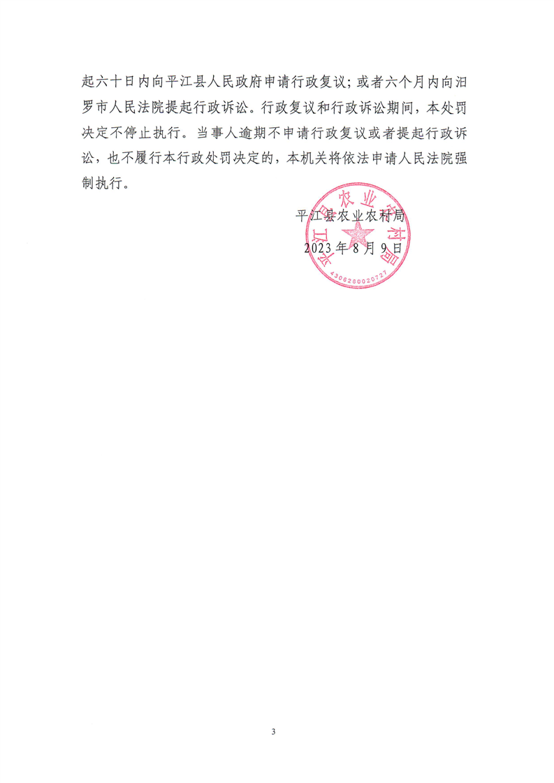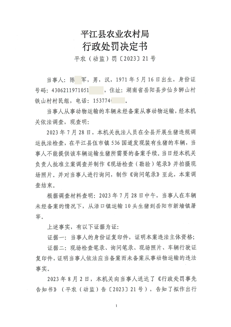 平江县农业农村局行政处罚决定书 平农(动监)罚〔2023〕21号