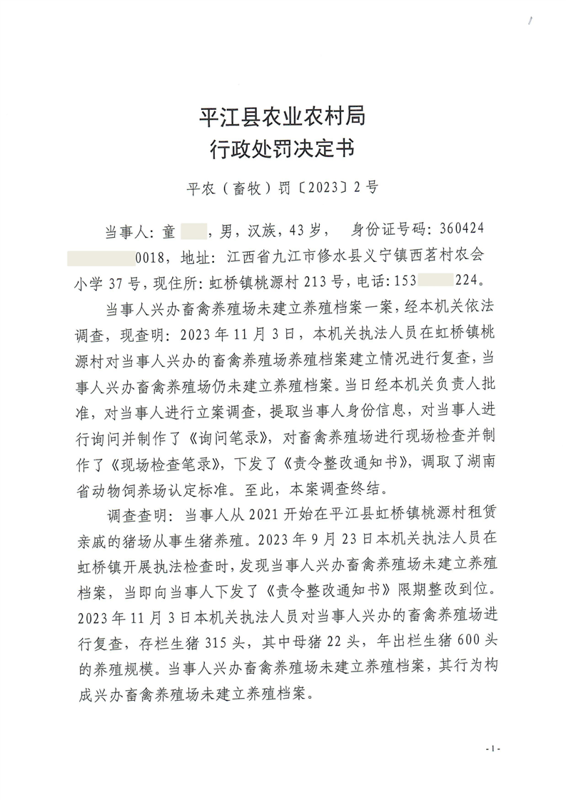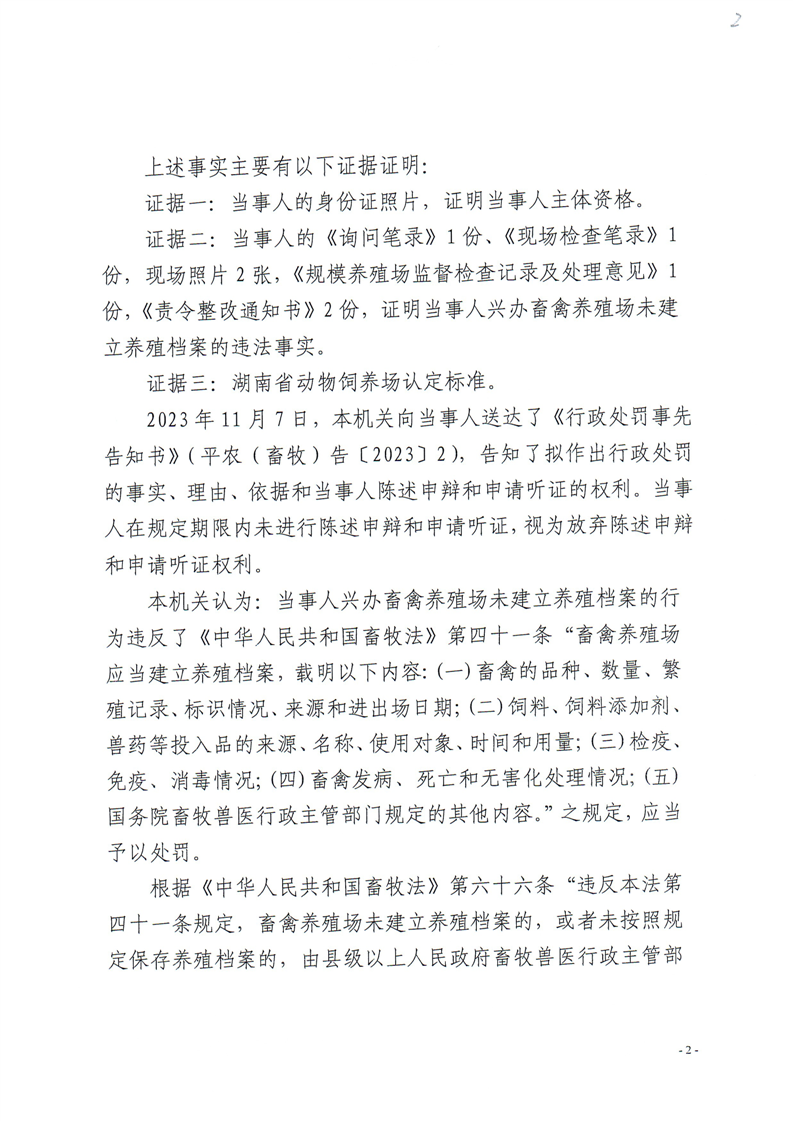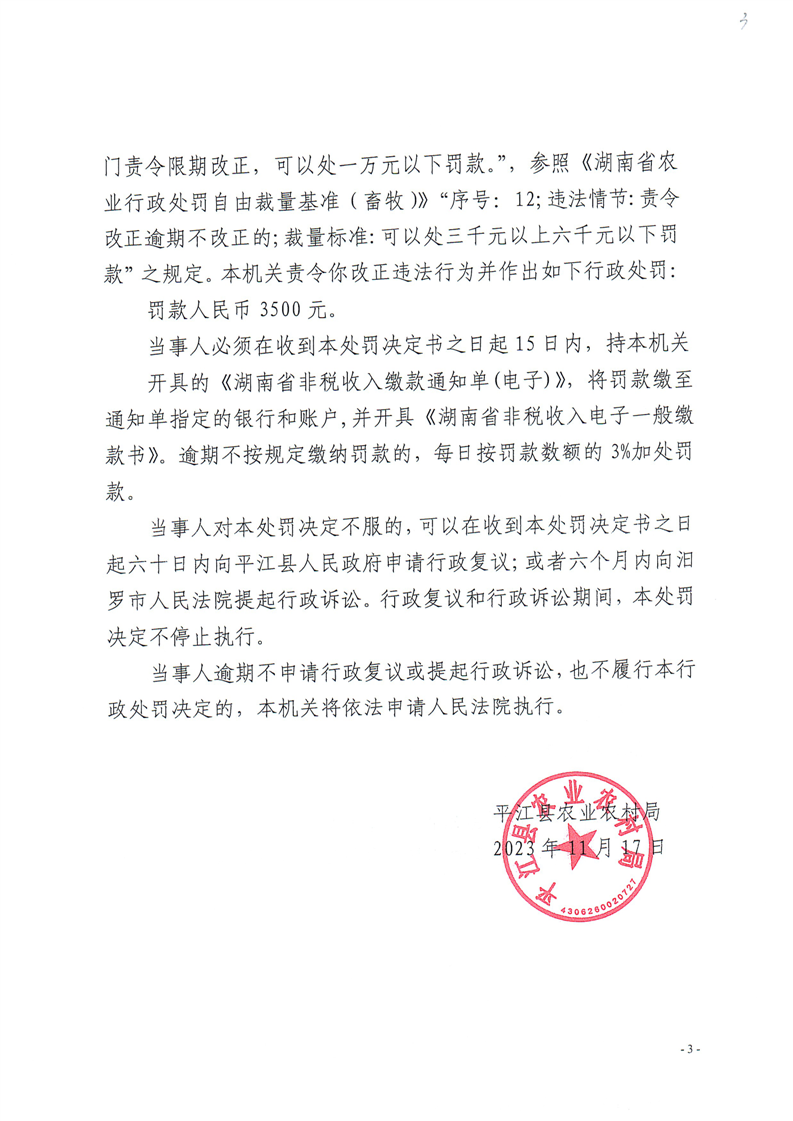 平江县农业农村局行政处罚决定书 平农(畜牧)罚〔2023〕2号