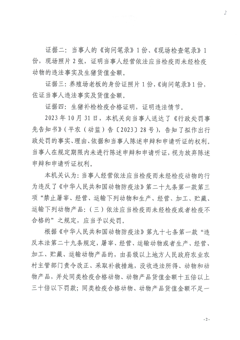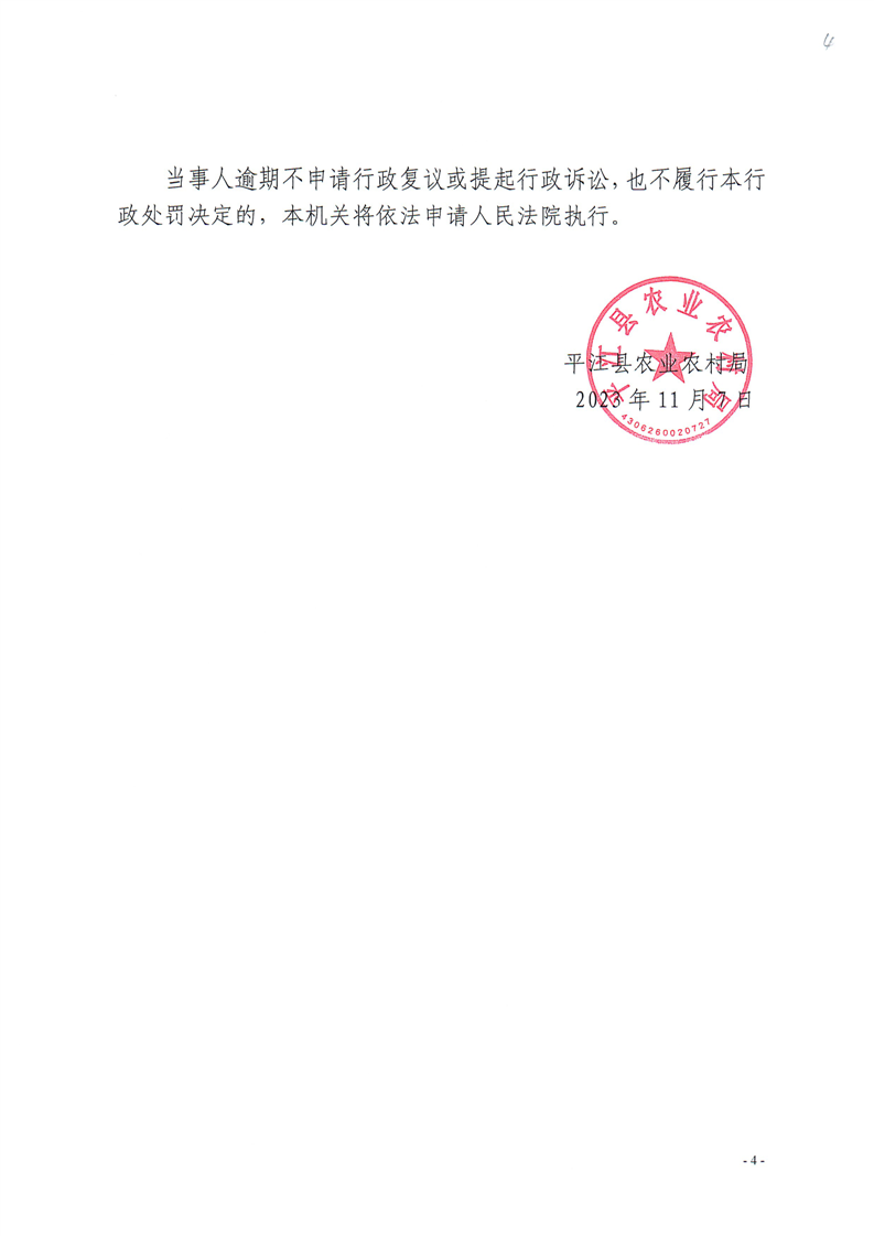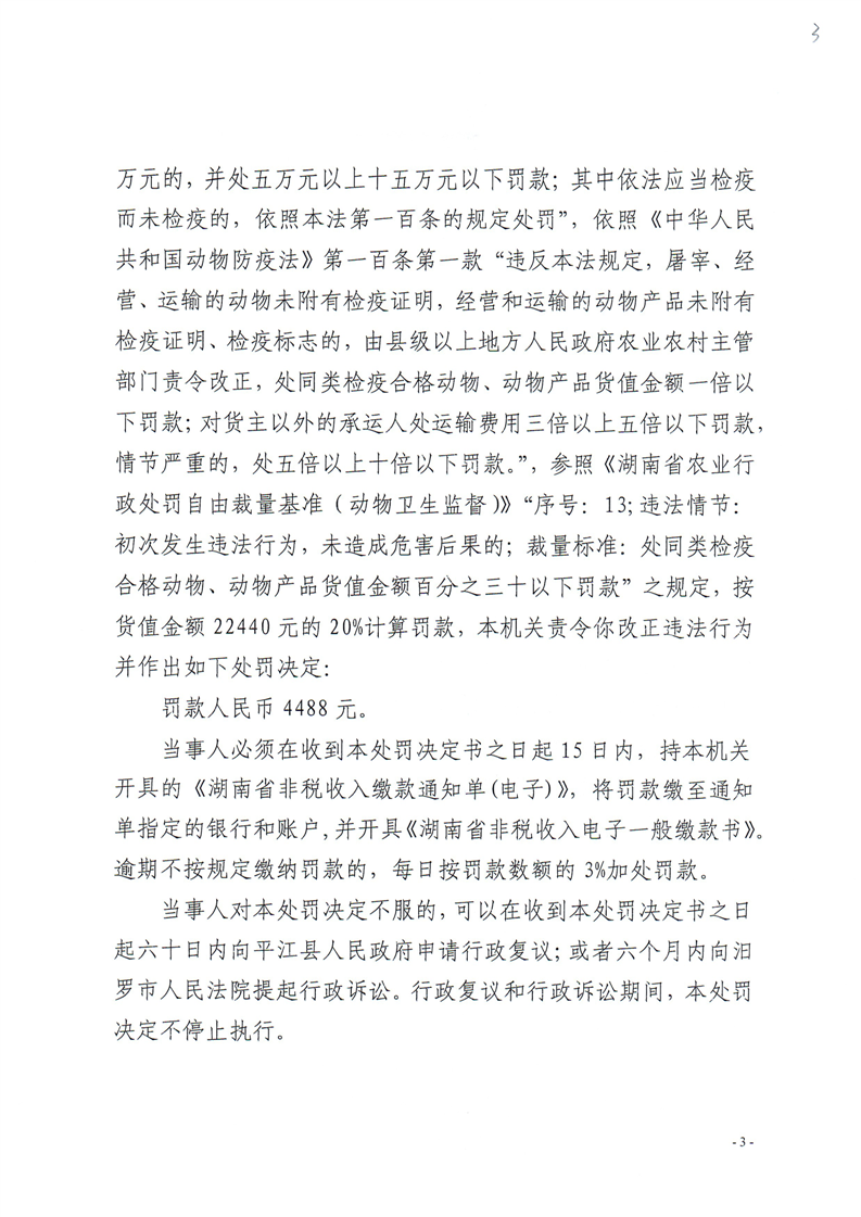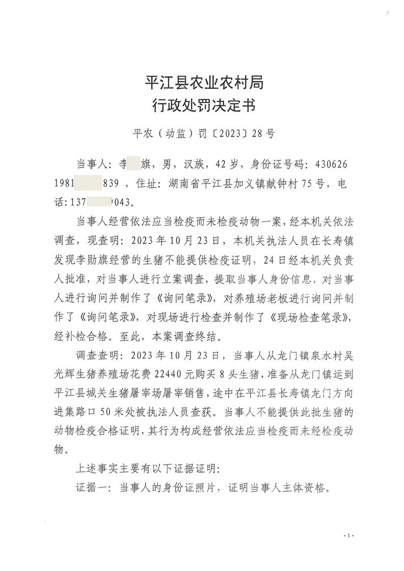 平江县农业农村局行政处罚决定书 平农(动监)罚〔2023〕28号