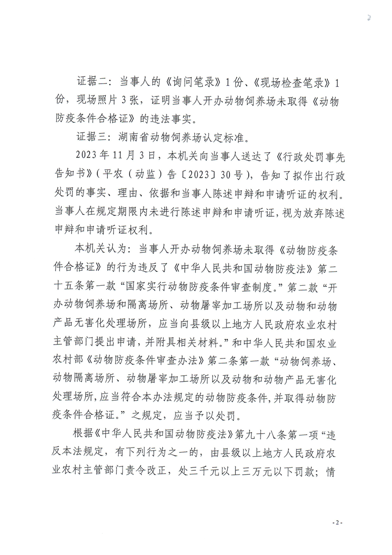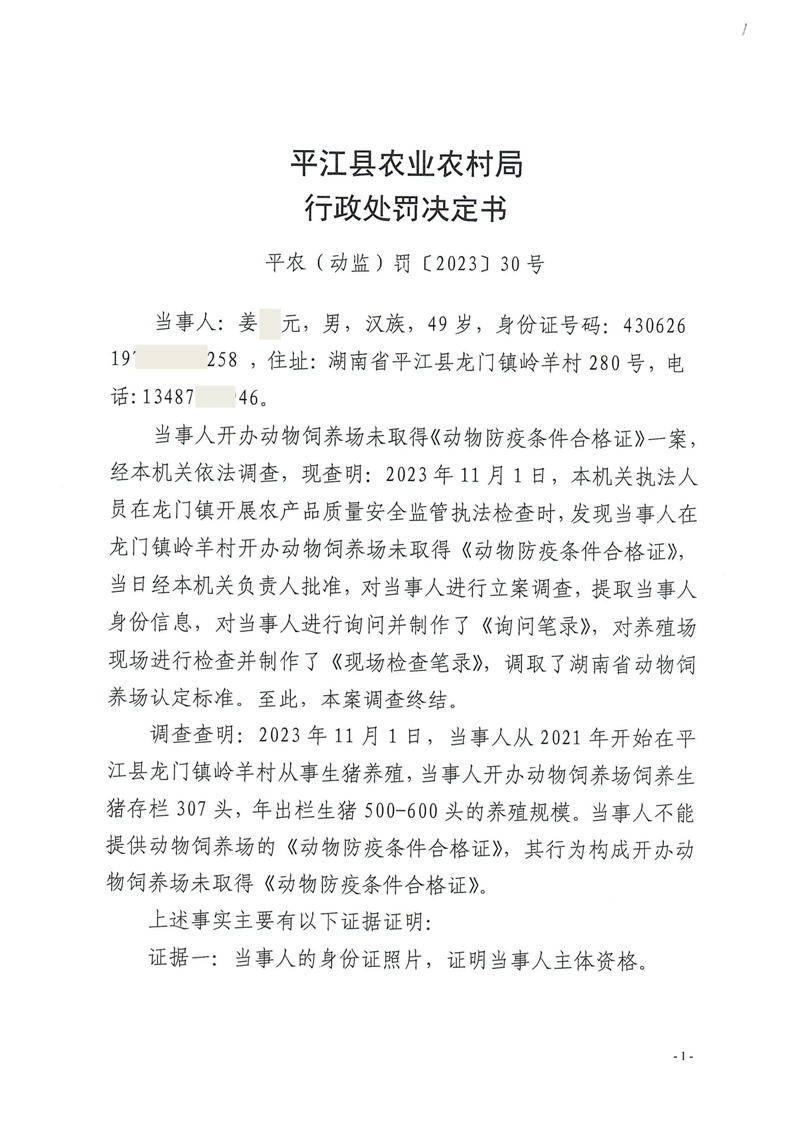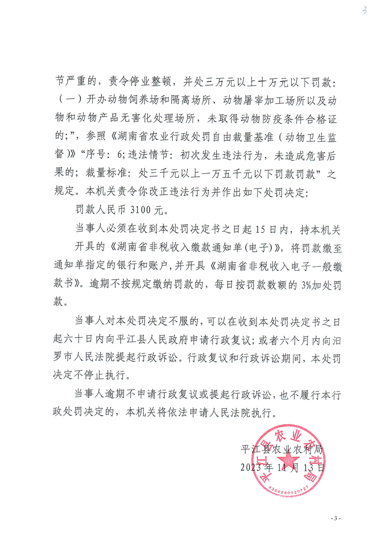 平江县农业农村局行政处罚决定书 平农(动监)罚〔2023〕30号