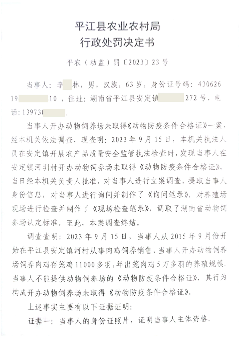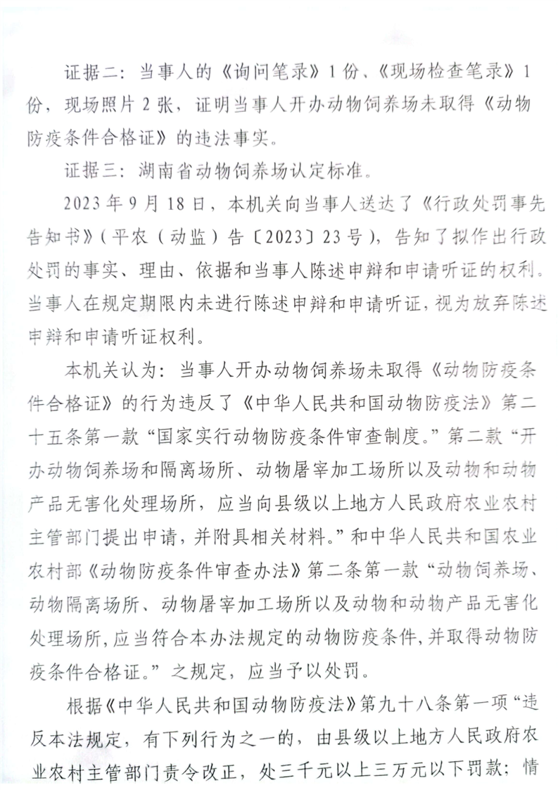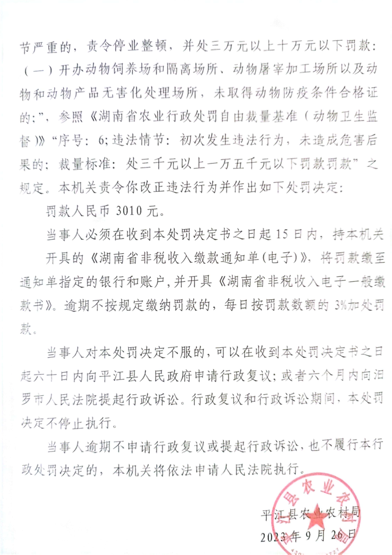 平江县农业农村局行政处罚决定书 平农(动监)罚〔2023〕23号