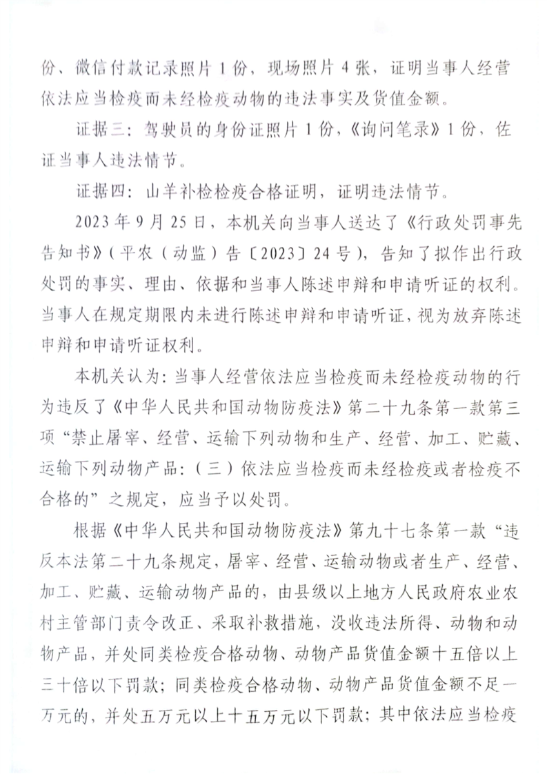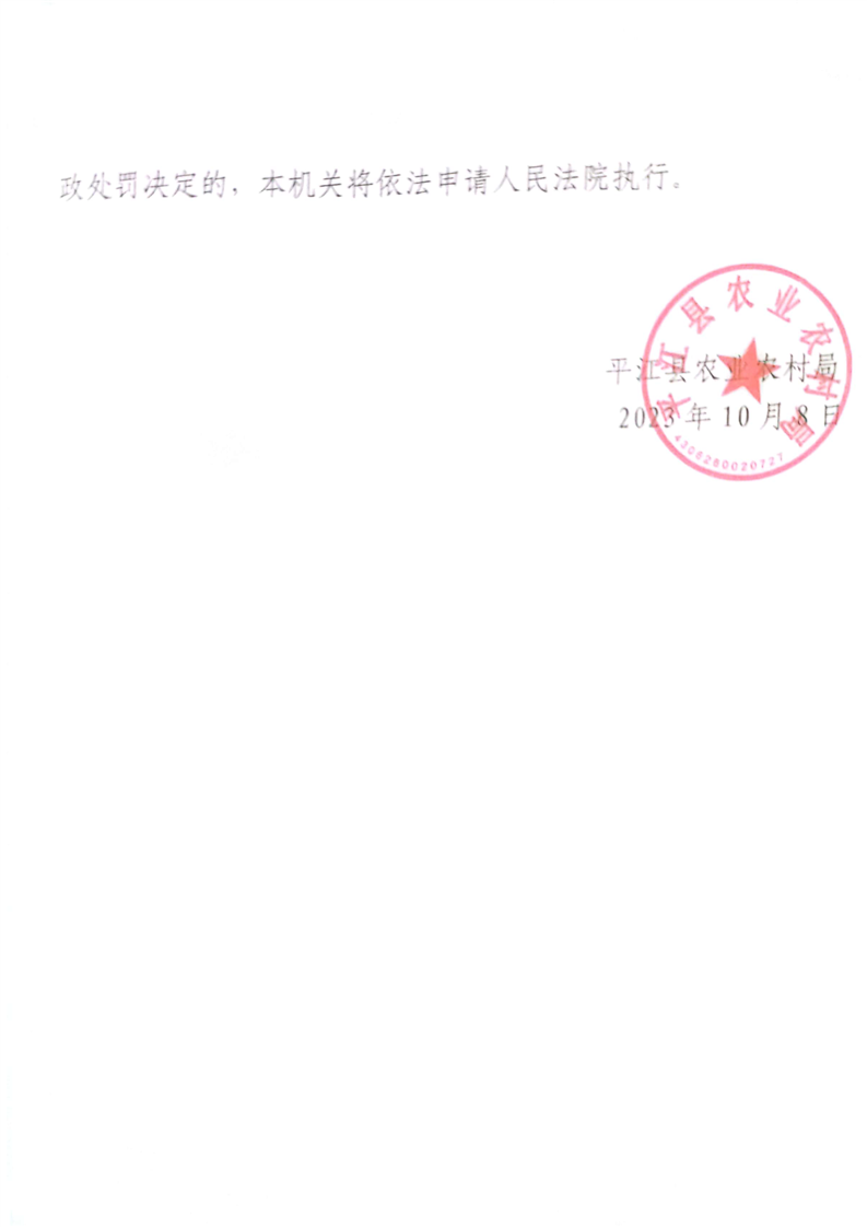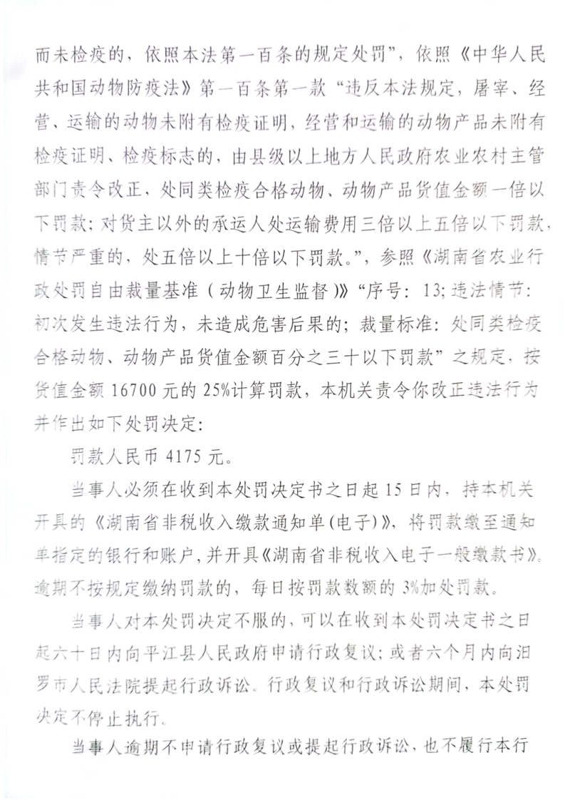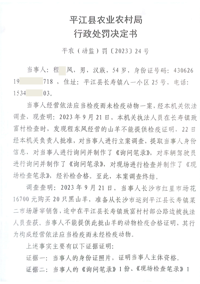 平江县农业农村局行政处罚决定书 平农(动监)罚〔2023〕24号
