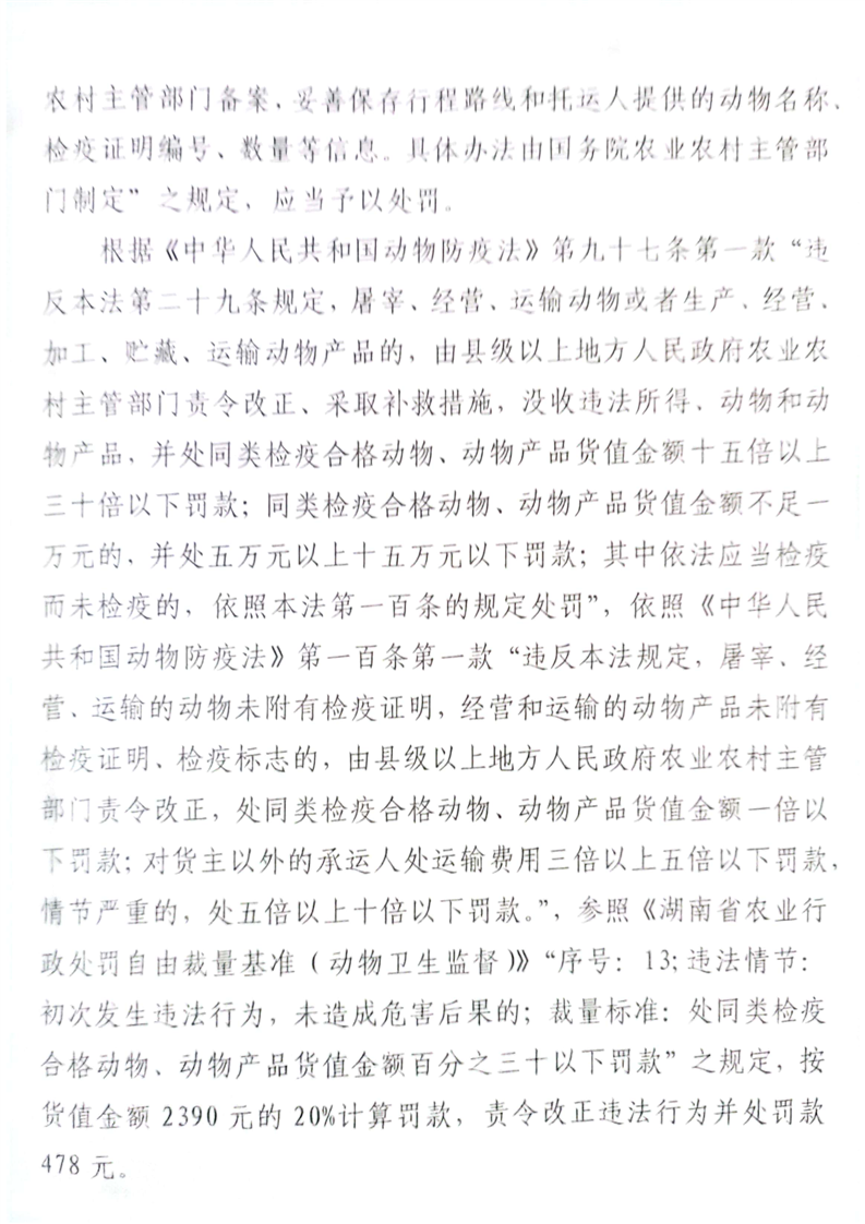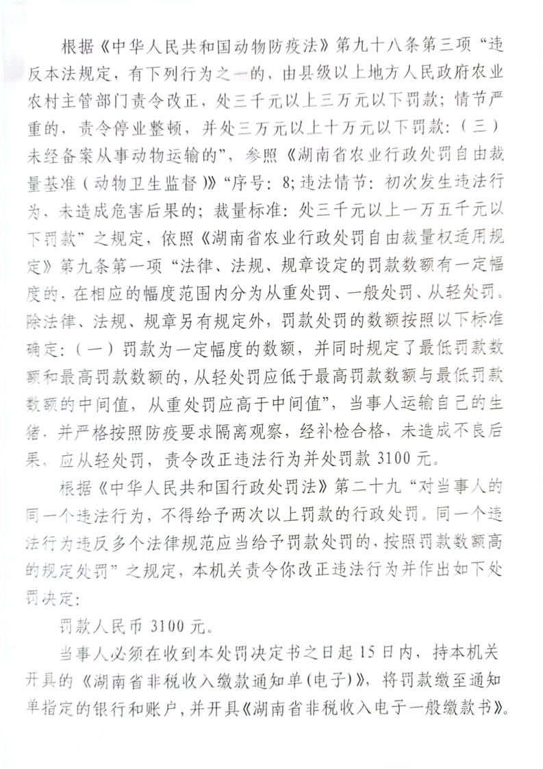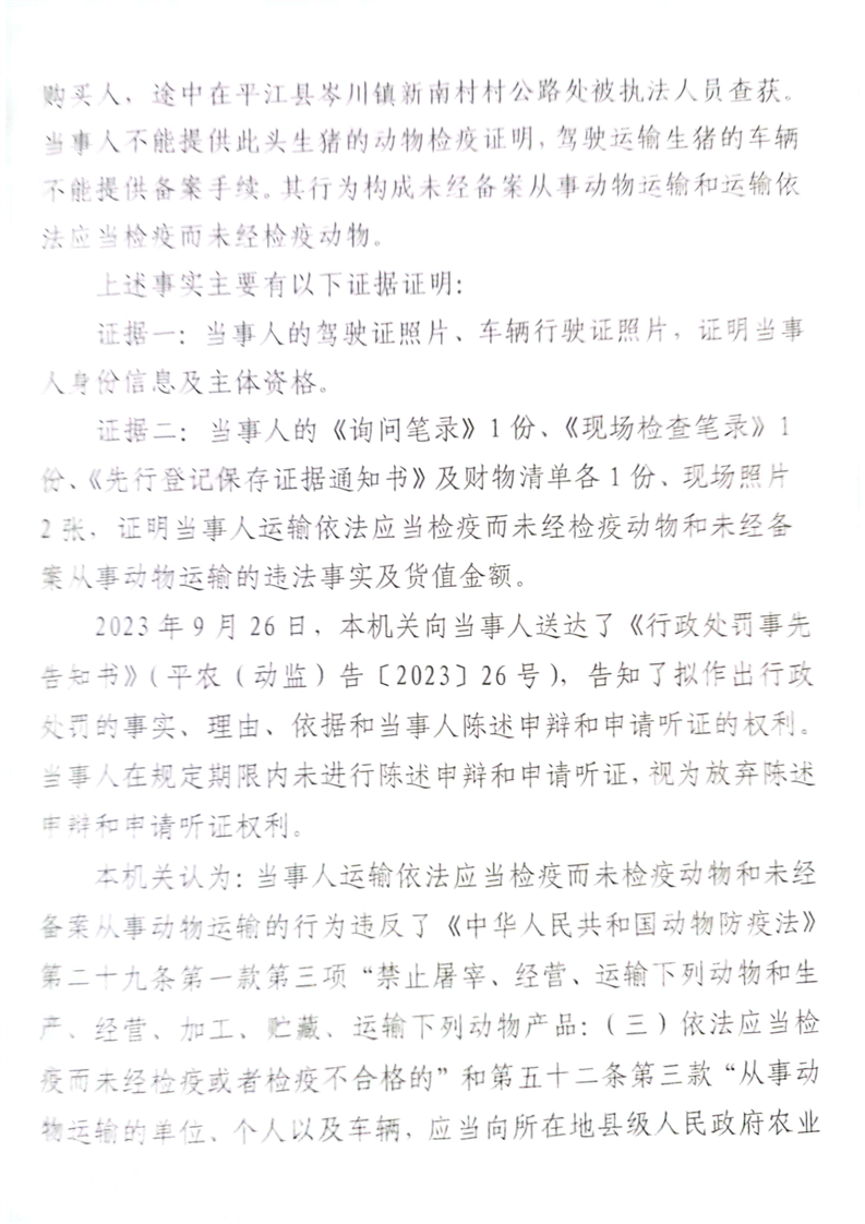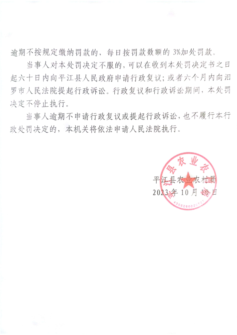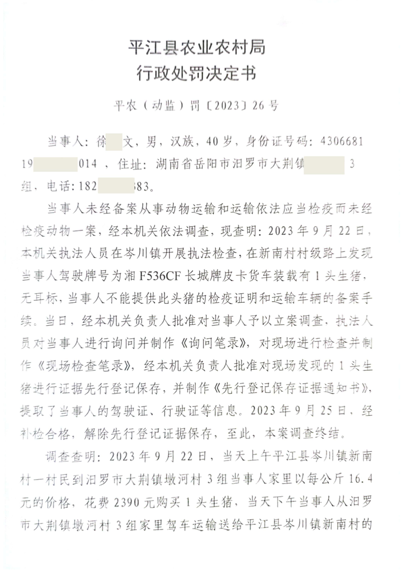 平江县农业农村局行政处罚决定书 平农(动监)罚〔2023〕26号