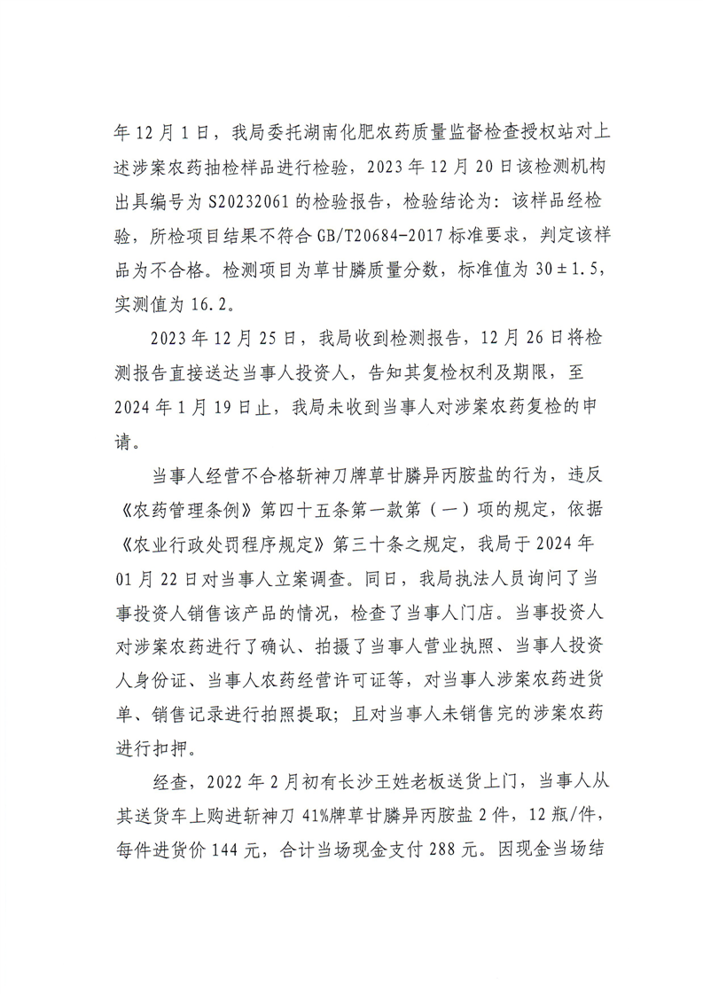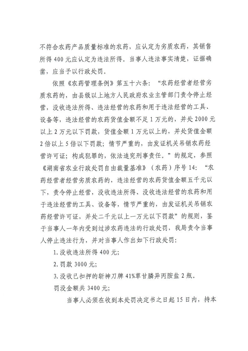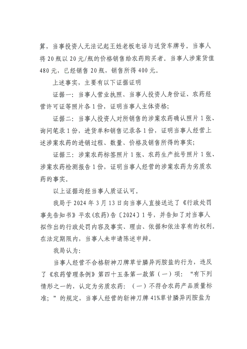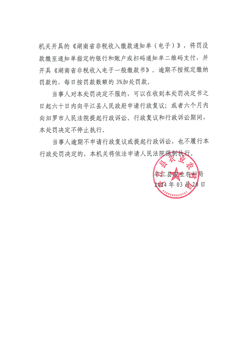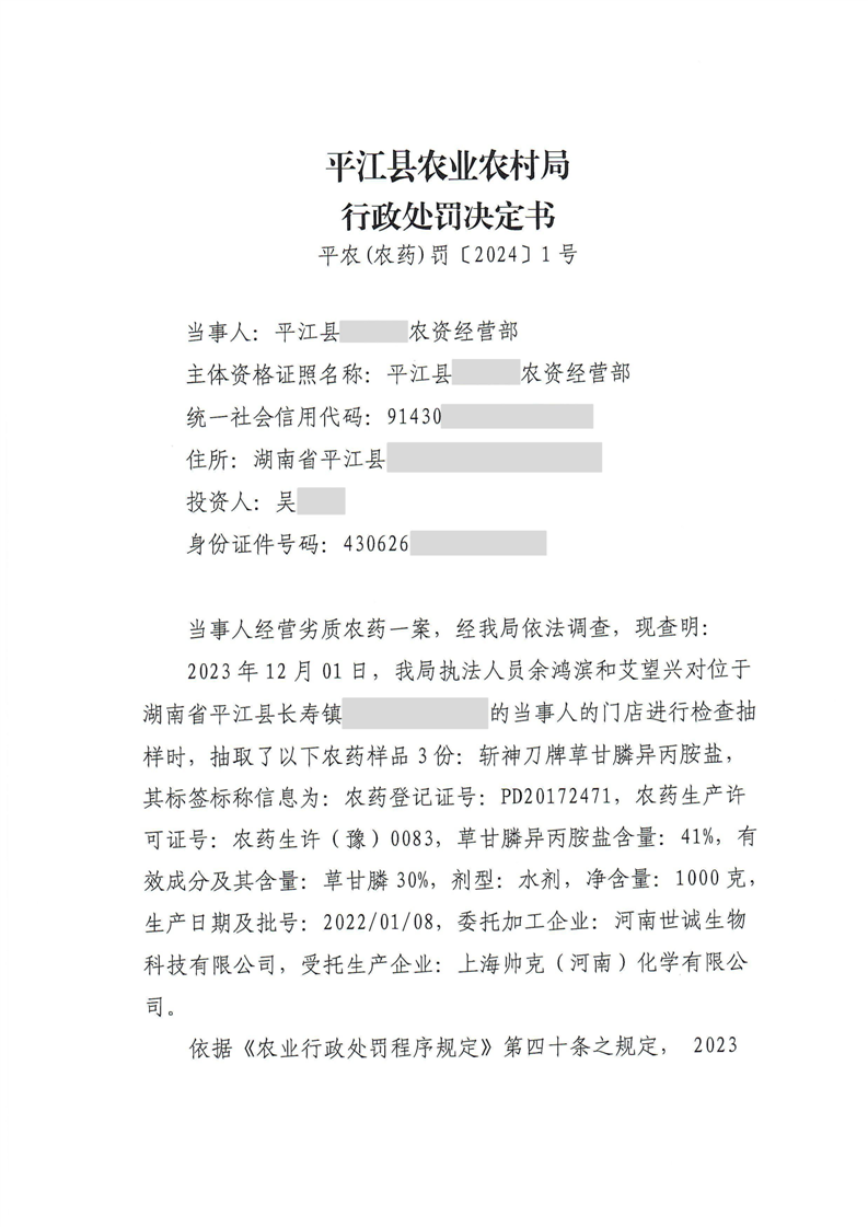 平江县农业农村局行政处罚决定书 平农(农药)罚〔2024〕1号