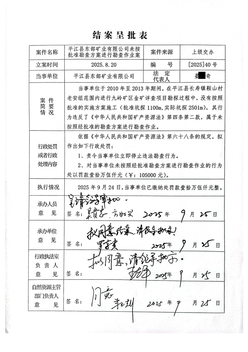 平江县东部矿业有限公司未按批准勘查方案勘查