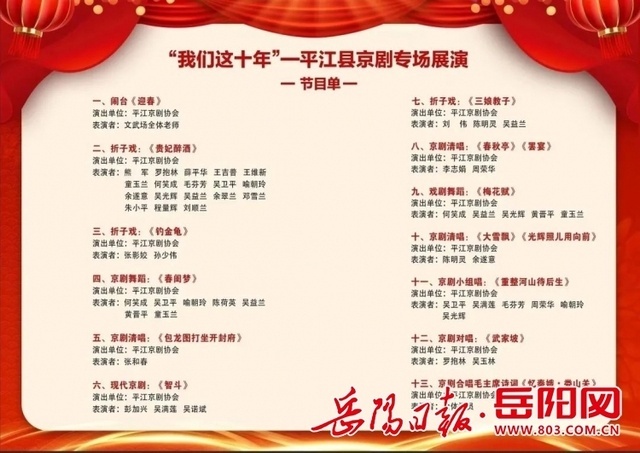 本次活动由平江县文化旅游广电体育局主办,平江县文化馆、平江县京剧艺术票友协会承办。本场演出单位来自:平江县京剧艺术票友协会。