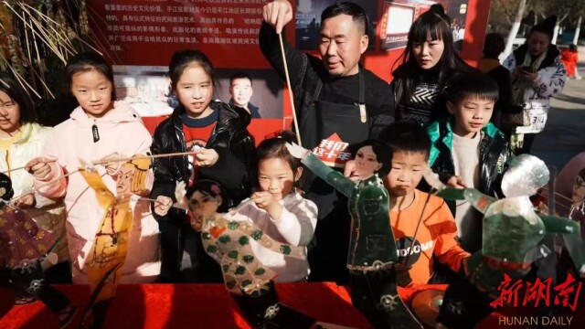 在平江皮影戏展台,省级非遗传承人钟志远向孩子们展示了为此次春节活动特别制作的兔子皮影,大多数孩子们都是第一次零距离接触这种古老独特的民间表演艺术。表演结束,钟志远和他的徒弟们引导小朋友们将皮影人物的头、上身、下身、两腿、两上臂、两下臂和两手等部件连缀组成,最后连接耍杆,配合音乐做出各式各样的动作,引发了小朋友的浓厚的兴趣。“皮影戏”在这群“皮孩子”当中“皮”出了精彩!