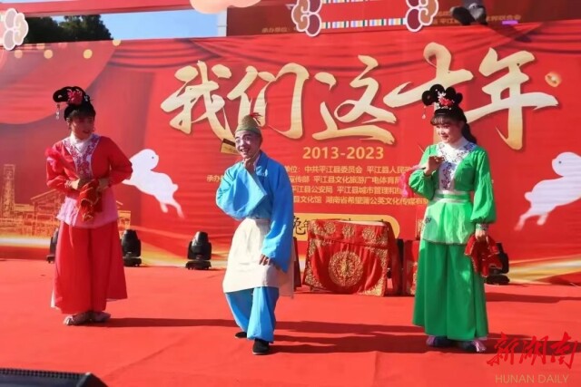 由平江县委县政府主办,县委宣传部、县文化旅游广电体育局、县文学艺术界联合会承办的2023年“非遗过大年•文化进万家”之“我们这十年”系列群众文体活动,于正月初八火热拉开了帷幕,平江民歌、花灯戏、皮影戏、黄茶制作、花丝镶嵌、古法斫琴、阜山窑、古法茶油、手工铜器、木雕等32道由平江非物质文化遗产项目组成的节日盛宴吸引了超20万市民和游客。