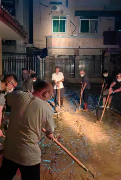 洪水肆虐后的平江县城满目疮痍,碧潭新村居民小区,因临近汨罗江边,是受灾最严重的小区之一,7月1日时的最高水位将近3米,洪水退去后留下满院的淤泥和遍地的垃圾,经高温暴晒后散发出刺鼻的气味。7月4日上午,平江县城投中心组织包括棚改机动巡察组在内的40余名应急队员紧急奔赴碧潭新村小区全面开展清淤除障工作。