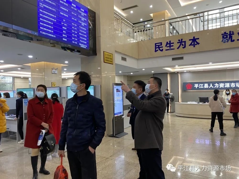 ▲平江县人社局党组书记、局长谢朝晖,党组成员、副局长余献忠现场指导工作