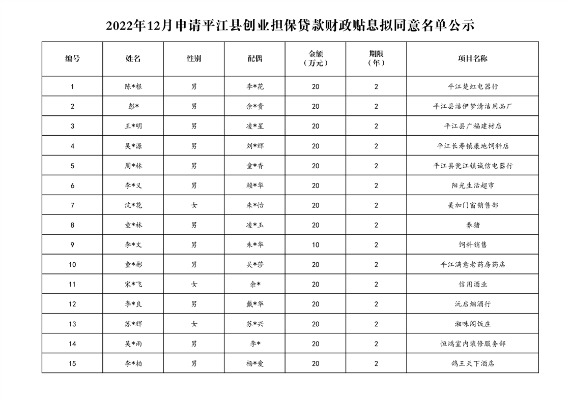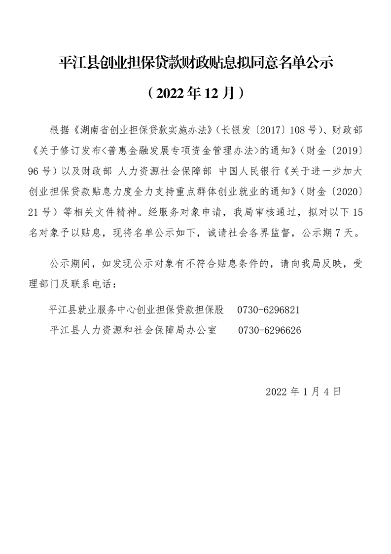 2022年12月平江县创业担保贷款财政贴息拟同意名单公示