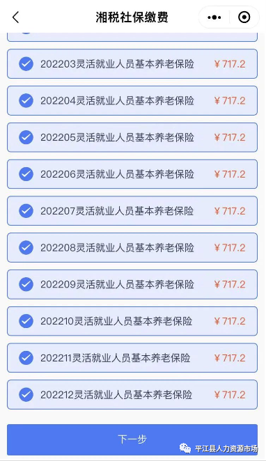 三、输入缴费个人相关信息,选择“灵活就业人员养老保险”,点击“下一步”按钮
