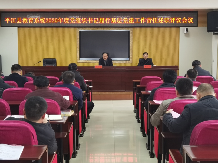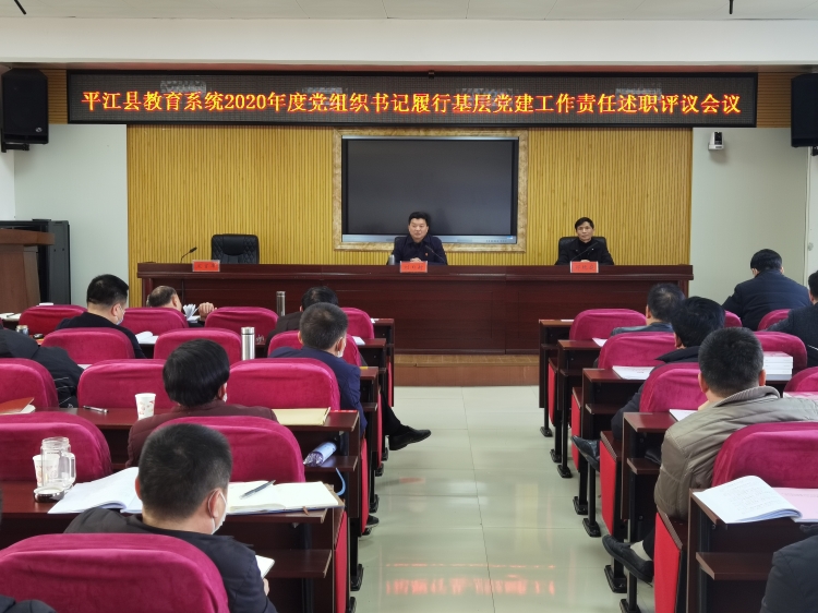 1月29日,平江县教育系统召开2020年度党组织书记履行基层党建工作责任述职评议会议,全体局党组、局务会成员,各学区、县直学校党组织主要负责同志,局机关各支部委员、工会委员与会。县委组织部副部长、县委“两新”工委书记郑湘平到会指导。会议由县教育局党组副书记、副局长、县委教育党工委副书记郑振庭主持。