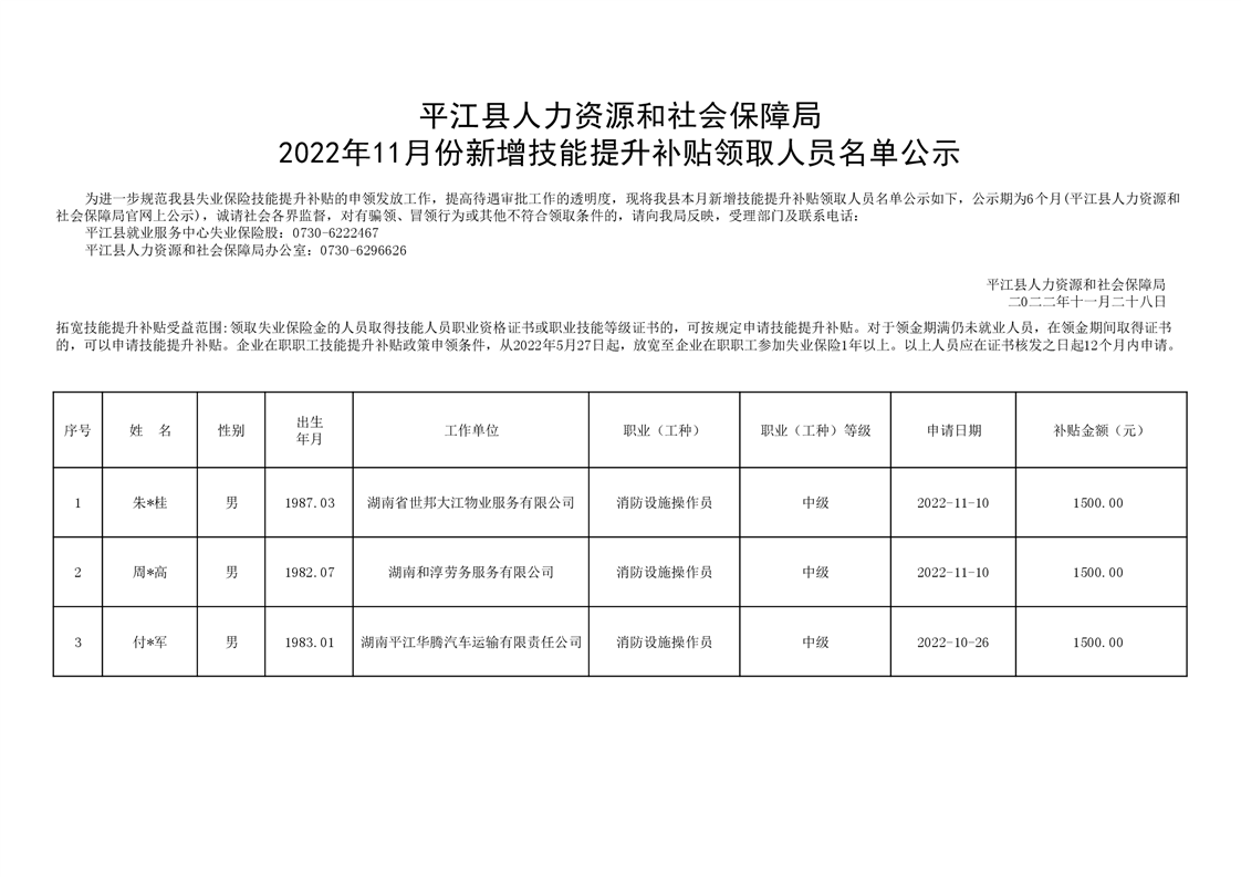 2022年11月新增技能提升补贴领取人员名单公示
