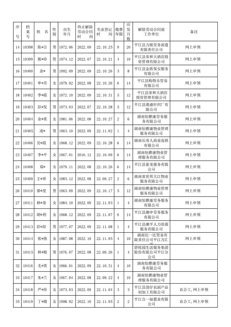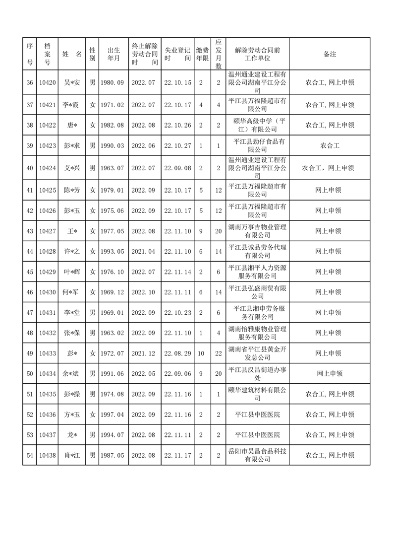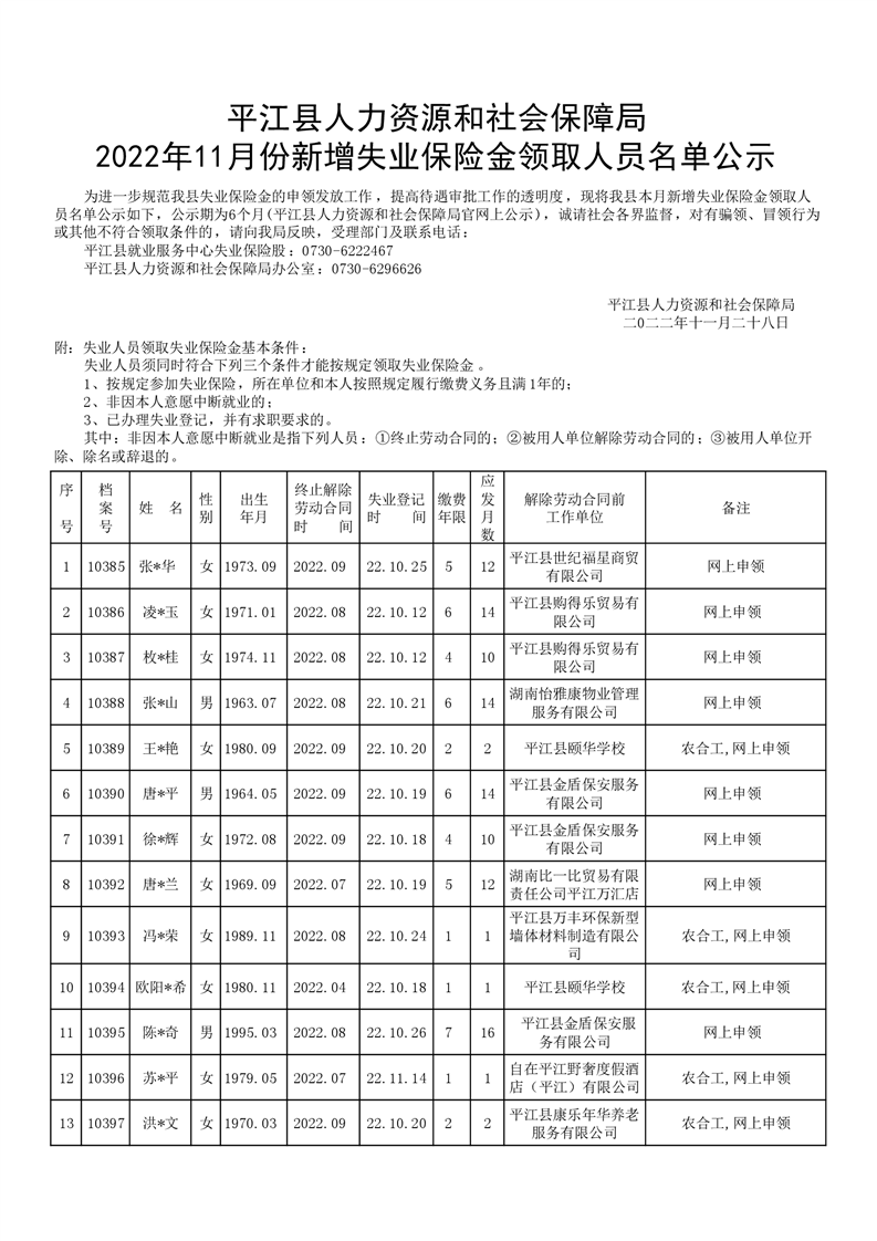 2022年11月新增失业保险金领取人员名单公示