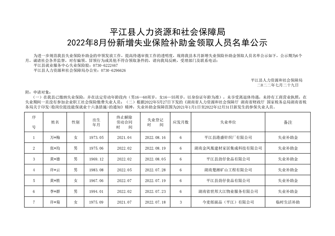 2022年8月新增失业保险补助金领取人员公示