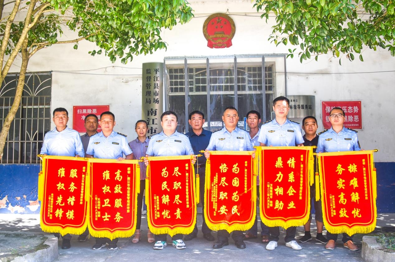 8月8日,南江镇七位经营业主来到县市场监管局南江所,分别赠送“服务楷模 维权先锋”“尽职尽责 为民解忧”等锦旗到该所,并对市场监管部门倾情服务、调解消费纠纷表示衷心感谢。