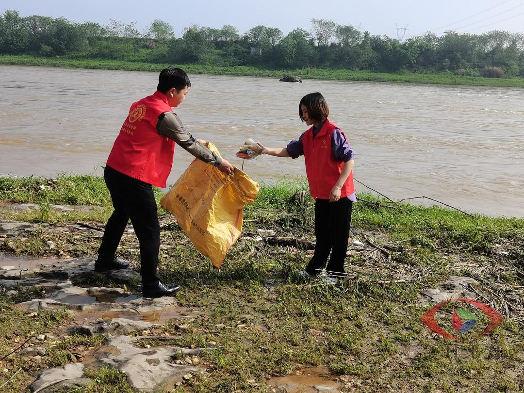4月20日上午,园艺示范中心的青年志愿者们穿上红色小马甲,拿着蛇皮袋直奔汨罗江沿岸。