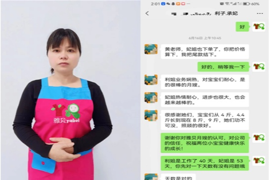 在大家的帮助下,滕承妃报名参加了雅贝第二期“母婴护理员培训班”,学成结业后,老师又安排新老学员“传帮带”,安排她和一位经验足的月嫂学习一起上岗,到客户家里照顾一对双胞胎宝宝,工资4680元/月,她一共做了2个月,工作“第一单”就拿到了9000多元,愿望成真的那一刻,滕承妃脸上笑开了花,其忠厚朴实的性格和耐心细致的工作态度也得到客户的认可并续单。