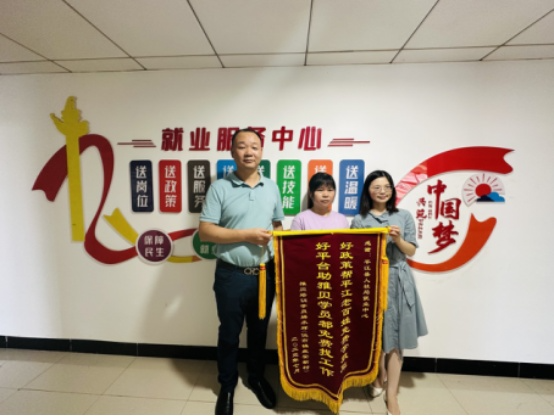 7月10日上午,今年培训上岗的平江“月嫂”滕承妃到县人社局赠送锦旗,感谢政府“实打实”的免费技能培训好政策,帮助其实现从“务工难”到“高收入”的华丽转身,