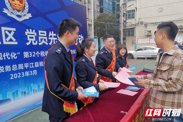3月31日,国家税务总局平江县税务局联合汉昌街道四柱路社区在奥星居民小区开展“税法宣传进社区 党员先锋在行动”活动,拉开第32个税收宣传月活动序幕。