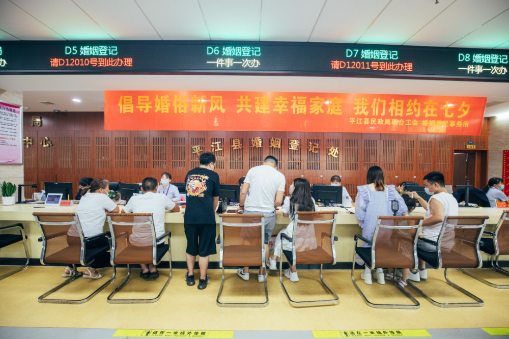 平江县民政局在县婚姻登记场所,设置婚前辅导室、婚姻家庭咨询室、离婚疏导室、法律咨询室,建立专职社工站和新时代文明实践站,搭建起了“四室两站”多维度服务平台。