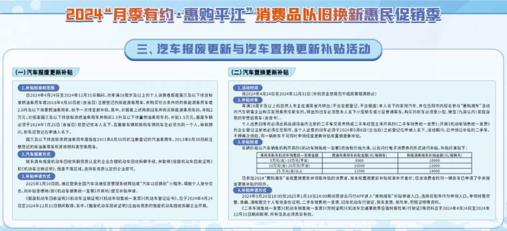此次消费品以旧换新活动是政府推出的一项惠民举措。消费者可通过云闪付APP进入“湖南节能家电”小程序,进行线上实名认证,完成资格核验后领取家电补贴卷,在参与企业购买补贴范围内的家电产品,按产品销售价格享受相关比例折扣。补贴时间为:1.汽车类:4月24日至12月31日。2.家电类、电动自行车类:9月6日至12月31日。3.家装厨卫类:7月1日至12月31日。(补贴资金使用完毕或政策期满即止)。